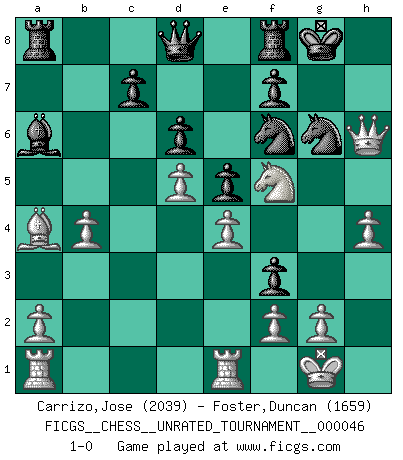 Last move : 1-0 2016 April 2 17:57:28 [Event "FICGS__CHESS__UNRATED_TOURNAMENT__000046"] [Site "FICGS"] [Date "2016.03.19"] [Round "1"] [White "Carrizo,Jose"] [Black "Foster,Duncan"] [Result "1-0"] [WhiteElo "2039"] [BlackElo "1659"] 1.e4 b6 2.d4 Bb7 3.Bd3 e6 4.Nf3 h6 5.O-O g6 6.Nc3 a6 7.Be3 Bg7 8.Qd2 d6 9.Rfe1 Ne7 10.d5 e5 11.Ne2 Nd7 12.c4 Nc5 13.Bc2 g5 14.b4 Nd7 15.Ng3 Nf6 16.Ba4+ b5 17.cxb5 O-O 18.bxa6 Bxa6 19.h4 g4 20.Bxh6 gxf3 21.Bxg7 Kxg7 22.Qg5+ Ng6 23.Nf5+ Kg8 24.Qh6 1-0 Owen defense Kingside Castling by player White (move 5) Kingside Castling by player Black (move 17) Player White won this chess game. Follow this game move after move (download)Chess is a terrible game. If you have no center, your opponent has a freer position. If you do have a center, then you really have something to worry about ! (Siegbert Tarrasch) Ich würde die 30 stärksten Spieler der USA im Simultanspiel besiegen. (José Raúl Capablanca) Un mal plan es mejor que no tener ningún plan. (Frank Marshall) Les échecs c'est le défi de l'alpiniste, toujours plus haut, prêt à tout pour monter à l'assaut du Roi ennemi. Les échecs, c'est de la musique en mouvement, un ballet majestueux pour les yeux. C'est de la poésie composée par les fantômes du passé qui au même titre que Rimbaud ou Verlaine méritent notre admiration. Les échecs, c'est de la peinture ou le moindre mouvement modifie le tableau pour en faire un Picasso ou un Van Gogh. Les échecs, c'est tout et rien, c'est la vie et la mort. Jjulie33 sur le forum de France-Echecs. But they are useless. They can only give you answers. (Pablo Picasso, about computers)