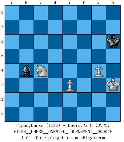Last move : 1-0 2017 February 10 2:49:25 [Event "FICGS__CHESS__UNRATED_TOURNAMENT__000046"] [Site "FICGS"] [Date "2016.03.19"] [Round "1"] [White "Pipac,Darko"] [Black "Davis,Mark"] [Result "1-0"] [WhiteElo "1222"] [BlackElo "0973"] 1.e4 e5 2.Nf3 Nc6 3.Bb5 d6 4.h3 Bd7 5.d3 Nf6 6.Bg5 Be7 7.Nc3 O-O 8.Bxc6 Bxc6 9.O-O h6 10.Bxf6 Bxf6 11.Nd5 Bxd5 12.exd5 c6 13.dxc6 bxc6 14.c3 Rb8 15.b3 Re8 16.Rb1 Qa5 17.Qc2 d5 18.c4 d4 19.Qd2 Qc7 20.Rfe1 Rbd8 21.Qb4 c5 22.Qb5 Rb8 23.Qa4 Re6 24.b4 cxb4 25.Rxb4 Reb6 26.a3 Rxb4 27.axb4 Kh7 28.b5 Rb7 29.Nd2 Bg5 30.Nf3 Bf6 31.Nd2 Qd7 32.Ne4 Be7 33.Rb1 f5 34.c5 Qd5 35.c6 Rc7 36.Nd2 e4 37.dxe4 fxe4 38.Nc4 e3 39.fxe3 d3 40.b6 axb6 41.Nxb6 Qxc6 42.Qd4 Qc2 43.Rb2 Qc1+ 44.Kf2 Bc5 45.Qe4+ g6 46.Nc4 Rf7+ 47.Kg3 Qe1+ 48.Kh2 h5 49.Qxd3 Bf8 50.Ne5 Rg7 51.Nf3 Qa5 52.Rb5 Qc7+ 53.g3 Rd7 54.Rxh5+ Kg7 55.Rd5 Rxd5 56.Qxd5 Bd6 57.Qg5 Qc2+ 58.Kh1 Qd1+ 59.Ng1 Qd3 60.h4 Qa6 61.Kh2 Qc6 62.h5 Qc2+ 63.Kh3 Qc8+ 64.g4 Qe6 65.Qxg6+ Qxg6 66.hxg6 Kxg6 67.Nf3 Kh6 68.Nd2 Bb4 69.Nc4 1-0 This chess game has been lost on time (started : 2016.03.19 20:37:15) Ruy Lopez : Old Steinitz defense Kingside Castling by player Black (move 7) Kingside Castling by player White (move 9) 10 pieces endgame at move 56 : White KQNPPP , Black KQBP WHITE : King + 1 Queen 1 Knight 3 Pawns BLACK : King + 1 Queen 1 Bishop 1 Pawn 9 pieces endgame at move 65 : White KQNPPP , Black KQB WHITE : King + 1 Queen 1 Knight 3 Pawns BLACK : King + 1 Queen 1 Bishop 8 pieces endgame at move 65 : White KNPPP , Black KQB WHITE : King + 1 Knight 3 Pawns BLACK : King + 1 Queen 1 Bishop 7 pieces endgame at move 66 : White KNPPP , Black KB WHITE : King + 1 Knight 3 Pawns BLACK : King + 1 Bishop 6 pieces endgame at move 66 : White KNPP , Black KB WHITE : King + 1 Knight 2 Pawns BLACK : King + 1 Bishop Player White won this chess game. Follow this game move after move (download)The Pin is mightier than the sword. (Fred Reinfeld) Viele Opfer benötigen überhaupt keine konkrete Berechnung. Es genügt sich die entstehende Position kurz vorzustellen, um uns davon zu überzeugen, dass das Opfer korrekt ist. (Mikhail Nekhemyevich Tal) Mi estilo es algo parecido entre un poco de Tal y Petrosian. (Reshevsky) Les échecs sont un jeu par leur forme, un art par leur essence et une science par sa difficulté d'acquisition. Ils peuvent vous procurer autant de plaisir qu'un bon livre ou une belle musique, mais vous n'aurez une réelle joie que si vous arrivez à bien jouer. (Tigran Petrosian) Wisdom is the reward you get for a lifetime of listening when you'd have preferred to talk. (Doug Larson)