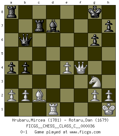 Last move : 0-1 2007 June 7 9:22:55 [Event "FICGS__CHESS__CLASS_C__000036"] [Site "FICGS"] [Date "2007.03.24"] [Round "1"] [White "Hrubaru,Mircea"] [Black "Rotaru,Dan"] [Result "0-1"] [WhiteElo "1781"] [BlackElo "1679"] 1.e4 c5 2.Nf3 d6 3.d4 cxd4 4.Nxd4 Nf6 5.Nc3 a6 6.Bg5 Bg4 7.f3 Bd7 8.Bc4 e6 9.Qd2 Be7 10.O-O O-O 11.Rad1 b5 12.Bb3 b4 13.Nce2 a5 14.Be3 Na6 15.c4 Qb8 16.Ng3 Rc8 17.Qe2 g6 18.Bg5 a4 19.Bc2 e5 20.Nb5 Rxc4 21.Nxd6 Rc7 22.Rf2 Nc5 23.Bxf6 Bxf6 24.f4 Ne6 25.fxe5 Bxe5 26.Nxf7 Bf4 27.Kh1 Kxf7 28.Qg4 Qb6 29.Rxf4+ Nxf4 30.Qxf4+ Kg8 0-1 Sicilian : Najdorf, 6.Bg5 Kingside Castling by player White (move 10) Kingside Castling by player Black (move 10) Player Black won this chess game. Follow this game move after move (download)The boy (then a 12 year old boy named Anatoly Karpov) doesn't have a clue about Chess, and there's no future at all for him in this profession. (Mikhail Botvinnik) Der Partner hat auch seine Existenzberechtigung. (Savielly Grigorievitsch Tartakower) Si pudieramos observar el interior de la cabeza de un jugador de Ajedrez, encontraríamos ahí un mundo lleno de sentimientos, imágenes, ideas, emoción y pasión. (Alfred Binet) Ne tendez aucun piège pour le plaisir ! Ne jouez rien dans l'espoir que l'adversaire réagisse de façon stupide ! Prenez toujours pour acquis que l'adversaire va trouver le meilleur coup ! Ne jouez jamais de coup dans l'espoir que l'adversaire ne voie pas la menace ! Chacun de vos coups doit améliorer la position d'une façon ou d'une autre. It's not the will to win, but the will to prepare to win that makes the difference. (Bear Bryant)