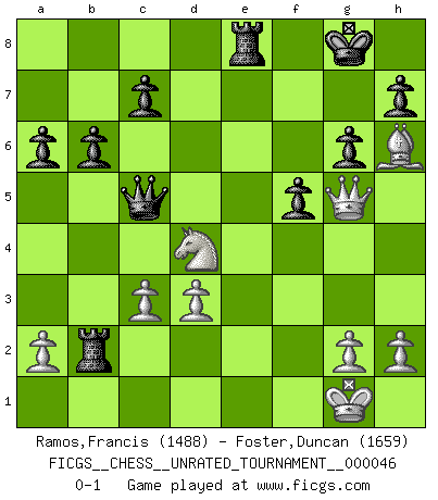 Last move : 0-1 2016 June 28 14:21:32 [Event "FICGS__CHESS__UNRATED_TOURNAMENT__000046"] [Site "FICGS"] [Date "2016.03.19"] [Round "1"] [White "Ramos,Francis"] [Black "Foster,Duncan"] [Result "0-1"] [WhiteElo "1488"] [BlackElo "1659"] 1.e4 b6 2.d3 Bb7 3.f4 g6 4.Nf3 Bg7 5.Be2 e6 6.Nc3 d6 7.Be3 Ne7 8.O-O Nd7 9.Qd2 O-O 10.Rae1 f5 11.Ng5 Rf6 12.e5 dxe5 13.fxe5 Nxe5 14.Bf3 Nxf3+ 15.Nxf3 a6 16.Bg5 Rf7 17.Rxe6 Bxf3 18.Rxf3 Qd7 19.Rfe3 Bd4 20.Bxe7 Qxe6 21.Bg5 Bxe3+ 22.Bxe3 Re8 23.Bh6 Qc6 24.Ne2 Rfe7 25.Nd4 Qc5 26.c3 Re2 27.Qg5 Rxb2 0-1 Owen defense Kingside Castling by player White (move 8) Kingside Castling by player Black (move 9) Player Black won this chess game. Follow this game move after move (download)Pawns are born free, yet they are everywhere in chains. (Rick Kennedy) Im Schach gibt es keinen Platz für Galanterie. (Irving Chernev) Botvinnik trataba de restarle el misterio al Ajedrez, siempre relacionandolo a situaciones de la vida ordinaria. El gustaba de llamar al Ajedrez un típico problema inexacto similar a aquellos de los cuales la gente siempre tiene que enfrentarse en la vida cotidiana. (Garry Kasparov) Aucun coup ne doit être joué sans but. (Pedro Damiano) The absolute truth is the thing that makes people laugh. (Carl Reiner)