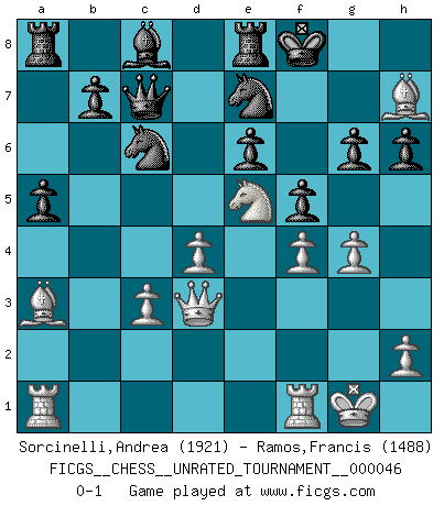 Last move : 0-1 2016 May 28 19:39:19 [Event "FICGS__CHESS__UNRATED_TOURNAMENT__000046"] [Site "FICGS"] [Date "2016.03.19"] [Round "1"] [White "Sorcinelli,Andrea"] [Black "Ramos,Francis"] [Result "0-1"] [WhiteElo "1921"] [BlackElo "1488"] 1.e4 c5 2.a3 e6 3.b4 cxb4 4.axb4 Bxb4 5.c3 Bc5 6.d4 Bb6 7.f4 Ne7 8.Nf3 O-O 9.Bd3 d6 10.O-O Nbc6 11.Nbd2 a5 12.Nc4 Bc7 13.e5 h6 14.exd6 Bxd6 15.Nfe5 Qc7 16.Nxd6 Qxd6 17.Ba3 Qc7 18.Qb1 Re8 19.Bh7+ Kf8 20.Qd3 f5 21.g4 g6 0-1 Sicilian defense Kingside Castling by player Black (move 8) Kingside Castling by player White (move 10) Player Black won this chess game. Follow this game move after move (download)The chessboard is the world, the pieces are the phenomena of the Universe, the rules of the game are what we call the laws of Nature and the player on the other side is hidden from us. (Thomas Huxley) Modernes Schach sorgt sich zuviel um Dinge wie Bauernstruktur usw. Vergessen Sie das, Schachmatt beendet das Spiel! (Nigel Short) Tu eres para mi la Reina en d8 y yo soy el Peón en d7!!. (GM Eduard Gufeld) Le joueur d'Echecs qui veut atteindre le top est obligé de développer son propre credo créatif. Alexeï Stepanovicth Souétine. Il est facile d'écrire des livres ! Ce qui est difficile, c'est de jouer ! (Alexeï Stepanovicth Souétine) Watch your thoughts; they become words. Watch your words; they become actions. Watch your actions; they become habits. Watch your habits; they become character. Watch your character; it becomes your destiny. (Frank Outlaw)