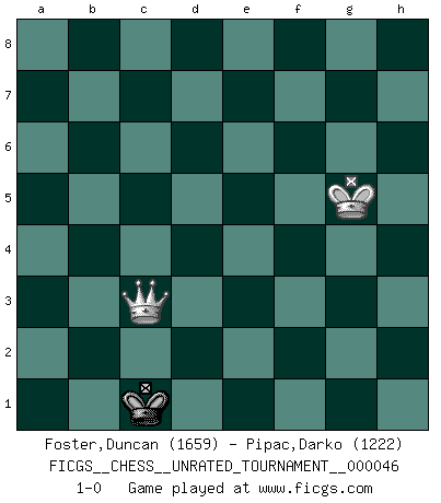 Last move : 1-0 2016 June 5 12:3:34 [Event "FICGS__CHESS__UNRATED_TOURNAMENT__000046"] [Site "FICGS"] [Date "2016.03.19"] [Round "1"] [White "Foster,Duncan"] [Black "Pipac,Darko"] [Result "1-0"] [WhiteElo "1659"] [BlackElo "1222"] 1.e4 e5 2.Nf3 Nc6 3.d4 exd4 4.Bc4 d6 5.c3 dxc3 6.Nxc3 Bg4 7.Qb3 Bxf3 8.gxf3 Nd4 9.Qa4+ Qd7 10.Bxf7+ Ke7 11.Qxd7+ Kxd7 12.O-O Nxf3+ 13.Kh1 g6 14.Bxg8 Rxg8 15.Be3 Bg7 16.Kg2 Ne5 17.Bd4 Nd3 18.Bxg7 Rxg7 19.b3 Re8 20.Rad1 Nc5 21.Rfe1 Rge7 22.Nd5 Re6 23.f3 c6 24.Nc3 Kc7 25.b4 Nd7 26.b5 Ne5 27.f4 Nc4 28.bxc6 bxc6 29.Kf3 Nb6 30.Re2 d5 31.e5 R6e7 32.Rc2 Rf7 33.Nb5+ Kd7 34.Nd6 Rxe5 35.Nxf7 Rf5 36.Ne5+ Kd6 37.Rxc6+ Ke7 38.Rc7+ Ke6 39.Rxa7 Nc4 40.Rxd5 Kxd5 41.Nxc4 Kxc4 42.Rxh7 g5 43.Kg4 Rxf4+ 44.Kxg5 Rf2 45.Rc7+ Kb4 46.Rb7+ Ka3 47.Ra7+ Kb2 48.h4 Rf3 49.h5 Ra3 50.Rxa3 Kxa3 51.h6 Kxa2 52.h7 Kb1 53.h8Q Kc1 54.Qc3+ 1-0 Scotch gambit Kingside Castling by player White (move 12) 10 pieces endgame at move 41 : White KRNPPP , Black KRPP WHITE : King + 1 Rook 1 Knight 3 Pawns BLACK : King + 1 Rook 2 Pawns 9 pieces endgame at move 41 : White KRPPP , Black KRPP WHITE : King + 1 Rook 3 Pawns BLACK : King + 1 Rook 2 Pawns 8 pieces endgame at move 42 : White KRPPP , Black KRP WHITE : King + 1 Rook 3 Pawns BLACK : King + 1 Rook 1 Pawn 7 pieces endgame at move 43 : White KRPP , Black KRP WHITE : King + 1 Rook 2 Pawns BLACK : King + 1 Rook 1 Pawn 6 pieces endgame at move 44 : White KRPP , Black KR WHITE : King + 1 Rook 2 Pawns BLACK : King + 1 Rook 5 pieces endgame at move 50 : White KRPP , Black K WHITE : King + 1 Rook 2 Pawns BLACK : King + 4 pieces endgame at move 50 : White KPP , Black K WHITE : King + 2 Pawns BLACK : King + 3 pieces endgame at move 51 : White KP , Black K WHITE : King + 1 Pawn BLACK : King + Promotion Queen by player White (move 53) Player White won this chess game. Follow this game move after move (download)You know you're going to lose. Even when I was ahead I knew I was going to lose. - On playing against Fischer. (Andrew Soltis) Karpov ist ein Museumsstück. (Garry Kasparov) ¡Examina movidas que hagan daño! Un buen ojo for movidas desvastantes es mucho mas importante que el conocimiento de principios estratégicos. (Purdy) Echiquier : carré parfait, comme la Jérusalem nouvelle décrite par l'auteur de l'Apocalypse, huit cases sur huit, exaltation du chiffre 4, symbole du cosmos aux quatre horizons... où le noir et le blanc, l'ombre et la lumière, le mal et le bien s'entremêlent et se conjuguent. (Robert Couffignal, Le Gambit du poète) For peace of mind, resign as general manager of the universe. (Douglas Adams)
