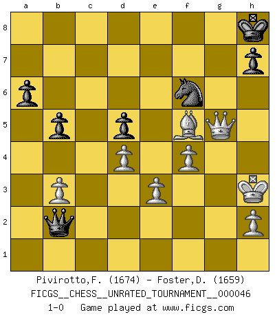 Last move : 1-0 2016 October 2 12:24:52 [Event "FICGS__CHESS__UNRATED_TOURNAMENT__000046"] [Site "FICGS"] [Date "2016.03.19"] [Round "1"] [White "Pivirotto,Filiberto"] [Black "Foster,Duncan"] [Result "1-0"] [WhiteElo "1674"] [BlackElo "1659"] 1.b3 b6 2.Bb2 Bb7 3.e3 a6 4.d4 e6 5.c4 d6 6.Nf3 Nd7 7.Nc3 g6 8.Bd3 Bg7 9.O-O Ne7 10.Re1 O-O 11.Qc2 Bxf3 12.gxf3 Nf5 13.Be4 Rc8 14.Kh1 c6 15.Rg1 Nh4 16.Qe2 d5 17.cxd5 cxd5 18.Bd3 b5 19.f4 Rc6 20.Rac1 Qc7 21.Qg4 Bf6 22.f5 Be7 23.fxe6 fxe6 24.f4 Nb6 25.Ne2 Nf5 26.Ng3 Rxc1 27.Bxc1 Kh8 28.Bd2 Ba3 29.Ba5 Qd6 30.Qh3 Nd7 31.Bc3 Bb4 32.Nxf5 exf5 33.Bxb4 Qxb4 34.Rxg6 Qd2 35.Bb1 Rc8 36.Rg1 Rc1 37.Qg2 Rxg1+ 38.Qxg1 Nf6 39.Bxf5 Qxa2 40.Qg5 Qa1+ 41.Kg2 Qb2+ 42.Kh3 1-0 Nimzovich-Larsen attack : Symmetrical variation Kingside Castling by player White (move 9) Kingside Castling by player Black (move 10) Player White won this chess game. Follow this game move after move (download)I am still a victim of Chess. It has all the beauty of art and much more. It cannot be commercialized. Chess is much purer than art in its social position. (Marcel Duchamp) Ich hatte meine größten Erfolge, als ich 47 Jahre alt war. Kasparow war noch nicht mal 42 und hat das Schach schon im Stich gelassen. (Viktor Kortschnoi) Bobby es la celebridad menos entendida y malinterpretada que camina el la faz de esta tierra. (Yasser Seirawan) Nous vivons dans un monde échiquéen : chaque jour qui passe est un défi à relever. (Philosophe Sasha) Art disturbs, science reassures. (Georges Braque, Le Jour et la Nuit)