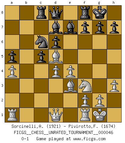 Last move : 0-1 2016 June 11 4:17:52 [Event "FICGS__CHESS__UNRATED_TOURNAMENT__000046"] [Site "FICGS"] [Date "2016.03.19"] [Round "1"] [White "Sorcinelli,Andrea"] [Black "Pivirotto,Filiberto"] [Result "0-1"] [WhiteElo "1921"] [BlackElo "1674"] 1.e4 e5 2.Nf3 Nc6 3.Bb5 a6 4.Ba4 Nf6 5.O-O Be7 6.d3 b5 7.Bb3 O-O 8.Nc3 d6 9.a3 Bg4 10.Be3 Na5 11.Ba2 c5 12.Nd5 Nc6 13.h3 Nxd5 14.Bxd5 Bd7 15.c3 a5 16.a4 b4 17.d4 bxc3 18.bxc3 exd4 19.cxd4 Rc8 0-1 Ruy Lopez : Closed defense Kingside Castling by player White (move 5) Kingside Castling by player Black (move 7) Player Black won this chess game. Follow this game move after move (download)A Chess game is divided into three stages: the first, when you hope you have the advantage, the second when you believe you have an advantage, and the third... when you know you're going to lose ! (Savielly Tartakower) Mit Schach schule ich mein Gefühl für Geometrie, was für Tennis und Schach gleichermaßen wichtig ist. (Boris Becker) En posiciones complicadas, Bobby Fischer pocas veces tuvo que temer de cualquiera. (Paul Keres) Pour se monter efficace, un Cavalier a besoin d'avant-postes ! Les Cavaliers font les meilleurs bloqueurs de pions passés. There is no vagueness without wind. (Chinese proverb)