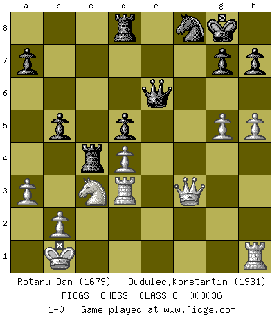 Last move : 1-0 2007 October 4 5:20:57 [Event "FICGS__CHESS__CLASS_C__000036"] [Site "FICGS"] [Date "2007.03.24"] [Round "1"] [White "Rotaru,Dan"] [Black "Dudulec,Konstantin"] [Result "1-0"] [WhiteElo "1679"] [BlackElo "1931"] 1.d4 Nf6 2.c4 e6 3.Nc3 d5 4.cxd5 exd5 5.Bg5 Be7 6.e3 c6 7.Qc2 Nbd7 8.Bd3 O-O 9.Nf3 Re8 10.O-O-O Nf8 11.h4 Be6 12.Rdg1 Ng4 13.Bxe7 Qxe7 14.Ng5 Kh8 15.Nxe6 fxe6 16.Qe2 Nf6 17.f4 c5 18.g4 cxd4 19.exd4 Qb4 20.g5 N6d7 21.Qe3 Rac8 22.Rg2 Nb6 23.Rc2 Nc4 24.Bxc4 Rxc4 25.a3 Qb6 26.Rd2 Rec8 27.h5 Kg8 28.Rd3 Qc6 29.Kb1 b5 30.f5 exf5 31.Qe5 Rd8 32.Qxf5 Qe6 33.Qf3 1-0 This chess game has been lost on time (started : 2007.03.24 22:8:4) Queen's pawn game Kingside Castling by player Black (move 8) Queenside Castling by player White (move 10) Player White won this chess game. Follow this game move after move (download)I believe that Chess possesses a magic that is also a help in advanced age. A rheumatic knee is forgotten during a game of Chess and other events can seem quite unimportant in comparison with a catastrophe on the chessboard. (Vlastimil Hort) Je mehr wir mit Computern analysieren, desto mehr glauben wir an Verteidigung. (Vladimir Kramnik) Bobby Fischer es el mas grande genio de Ajedrez de todos los tiempos. (Alexander Kotov) C'est la seule position que je connaisse où les deux camps sont mals. Propos prêtés à V. Anand. CHESS, n. f. [echecs, Fr.] A nice and abstruse game, in which two sets of puppets are moved in opposition to each other. (Dr Samuel Johnson, A Dictionary Of The English Language, 1755)