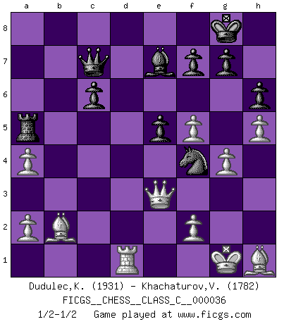 Last move : 1/2-1/2 2007 August 16 23:58:43 [Event "FICGS__CHESS__CLASS_C__000036"] [Site "FICGS"] [Date "2007.03.24"] [Round "1"] [White "Dudulec,Konstantin"] [Black "Khachaturov,Vadim"] [Result "1/2-1/2"] [WhiteElo "1931"] [BlackElo "1782"] 1.e4 c5 2.Nf3 d6 3.d4 cxd4 4.Nxd4 Nf6 5.Nc3 a6 6.g3 e6 7.Bg2 Be7 8.O-O O-O 9.b3 Qc7 10.Bb2 Nc6 11.Nce2 e5 12.Nxc6 bxc6 13.c4 Bg4 14.h3 Bh5 15.g4 Bg6 16.Ng3 Nd7 17.Qd2 Nc5 18.Rad1 Ne6 19.h4 h6 20.h5 Bh7 21.Nf5 Bxf5 22.exf5 Nf4 23.Rfe1 Rfd8 24.c5 a5 25.Bh1 a4 26.bxa4 Ra5 27.cxd6 Rxd6 28.Qe3 Rxd1 29.Rxd1 1/2-1/2 Sicilian : Najdorf, Zagreb (Fianchetto) variation Kingside Castling by player White (move 8) Kingside Castling by player Black (move 8) This chess game ended in a draw. Follow this game move after move (download)Chess, like love, like music, has the power to make people happy. (Siegbert Tarrasch) Schach ist ein Reich, wo sich die menschliche Phantasie frei entfalten kann. (David Bronstein) Fischer no está bajo la obligación de nadie. (Joseph Platz) Les échecs, c'est la lutte contre l'erreur. (Johannes Zukertort) Life is painting a picture, not doing a sum. (Oliver Wendell Holmes, Jr.)