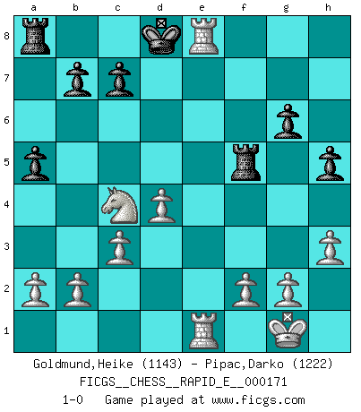 Last move : 1-0 2016 April 6 16:35:56 [Event "FICGS__CHESS__RAPID_E__000171"] [Site "FICGS"] [Date "2016.03.27"] [Round "1"] [White "Goldmund,Heike"] [Black "Pipac,Darko"] [Result "1-0"] [WhiteElo "1143"] [BlackElo "1222"] 1.e4 e5 2.Nf3 Nc6 3.Bc4 Nf6 4.d3 h6 5.c3 d5 6.exd5 Nxd5 7.O-O Bg4 8.h3 Bxf3 9.Qxf3 Nf4 10.Bxf4 exf4 11.Qxf4 Qd7 12.Re1+ Kd8 13.d4 Bd6 14.Qxf7 Qxf7 15.Bxf7 Rf8 16.Be6 Ne7 17.Nd2 Nf5 18.Nc4 Be7 19.Re5 g6 20.Rae1 h5 21.Bxf5 Rxf5 22.Rxe7 a5 23.Re8+ 1-0 Two knights defense (Modern Bishop's Opening) Kingside Castling by player White (move 7) Player White won this chess game. Follow this game move after move (download)Fischer is the strongest player in the world. In fact, the strongest player who ever lived. (Larry Evans) Schach ist Leben. (Robert James Fischer) Bobby solo arroja las piezas y solas caen en las casillas correctas. (Miguel Najdorf ) Vouloir jouer aux échecs contre soi-même est aussi paradoxal que vouloir marcher sur son ombre. (Stefan Zweig) It's not the size of the dog in the fight, it's the size of the fight in the dog. (Mark Twain)