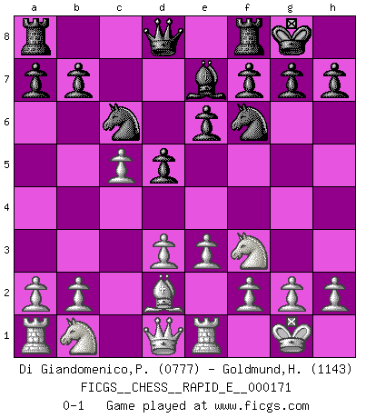 Last move : 0-1 2016 June 17 11:5:27 [Event "FICGS__CHESS__RAPID_E__000171"] [Site "FICGS"] [Date "2016.03.27"] [Round "1"] [White "Di Giandomenico,Pierino"] [Black "Goldmund,Heike"] [Result "0-1"] [WhiteElo "0777"] [BlackElo "1143"] 1.d4 d5 2.e3 Nf6 3.Nf3 Bf5 4.Bd3 Bxd3 5.cxd3 e6 6.O-O Be7 7.Bd2 O-O 8.Re1 c5 9.dxc5 Nc6 0-1 This chess game has been lost on time (started : 2016.03.27 19:28:57) Queen's pawn game Kingside Castling by player White (move 6) Kingside Castling by player Black (move 7) Player Black won this chess game. Follow this game move after move (download)The laws of Chess do not permit a free choice: you have to move whether you like it or not. (Emanuel Lasker) Taktik ist was man tun muß, wenn etwas zu tun ist. Strategie ist was man tun muß, wenn nichts zu tun ist. (Savielly Grigorievitsch Tartakower) Tu cuerpo tiene que estar en óptima condición. Tu Ajedrez se deteriora como lo hace tu cuerpo. No puedes separar la mente y el cuerpo. (Bobby Fischer) Les Echecs ne sont pas pour les âmes timides. Ils requièrent un homme entier, qui ne s'arrête pas aveuglément à ce qui a été déjà établi, mais qui tente individuellement de sonder les profondeurs du jeu. (W. Steinitz) Games, world of games... There's always an opponent, and there's always a victim. (Revolver, movie)