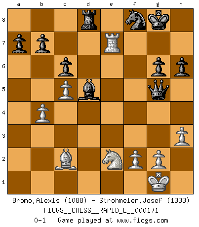Last move : 0-1 2016 July 10 9:58:50 [Event "FICGS__CHESS__RAPID_E__000171"] [Site "FICGS"] [Date "2016.03.27"] [Round "1"] [White "Bromo,Alexis"] [Black "Strohmeier,Josef"] [Result "0-1"] [WhiteElo "1088"] [BlackElo "1333"] 1.d4 Nf6 2.c4 g6 3.Nc3 Bg7 4.Nf3 O-O 5.e3 d6 6.h3 Nbd7 7.Be2 e5 8.dxe5 dxe5 9.b4 c6 10.O-O Qc7 11.Re1 Re8 12.Bb2 Nf8 13.Bd3 Rd8 14.c5 e4 15.Nxe4 Nxe4 16.Bxe4 Rxd1 17.Bxg7 Rxe1+ 18.Rxe1 Kxg7 19.Ng5 h6 20.Nf3 f5 21.Bd3 Be6 22.e4 fxe4 23.Bxe4 Bxa2 24.Bd3 Rd8 25.Bc2 Bd5 26.Nd4 Qf4 27.Re7+ Kg8 28.Ne2 Qg5 0-1 King's Indian defense, 3.Nc3 Kingside Castling by player Black (move 4) Kingside Castling by player White (move 10) Player Black won this chess game. Follow this game move after move (download)In Chess, as it is played by masters, chance is practically eliminated. (Emanuel Lasker) Ich moechte nie einem Club beitreten, der Leute wie mich als Mitglieder aufnimmt. (Woody Allen) Cuando veas una buena jugada, trata de encontrar otra mejor. (Emanuel Lasker) Comme les marins qui ont mille raisons différentes d'aller en mer, les joueurs d'échecs en ont tout autant avant de s'installer devant une table et jouer... (Vincent Bertignac, philosophe) We're missing something. (Gregory House, House M.D.)