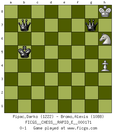 Last move : 0-1 2016 April 21 8:12:44 [Event "FICGS__CHESS__RAPID_E__000171"] [Site "FICGS"] [Date "2016.03.27"] [Round "1"] [White "Pipac,Darko"] [Black "Bromo,Alexis"] [Result "0-1"] [WhiteElo "1222"] [BlackElo "1088"] 1.e4 e5 2.Nf3 Nc6 3.d4 d6 4.dxe5 dxe5 5.Qxd8+ Kxd8 6.a3 Nf6 7.Bg5 Be7 8.Bb5 a6 9.Bxc6 bxc6 10.Nxe5 Bd7 11.Nxd7 Kxd7 12.Nc3 Rad8 13.O-O-O Kc8 14.f3 h6 15.Bxf6 Bxf6 16.Rxd8+ Rxd8 17.Ne2 Be5 18.h3 g6 19.Rd1 Rxd1+ 20.Kxd1 Bxb2 21.a4 Kb7 22.Kd2 Kb6 23.c3 Ka5 24.Nd4 Kxa4 25.Nxc6 a5 26.Kd3 Kb5 27.Ne5 a4 28.Nc4 a3 29.Nxb2 a2 30.Nc4 a1Q 31.Ne5 Qf1+ 32.Kd4 c5+ 33.Kd5 Qxg2 34.Nxf7 Qxf3 35.Ne5 Qxc3 36.Nxg6 Qd4+ 37.Ke6 Qxe4+ 38.Ne5 c4 39.Kf6 c3 40.Nf7 Qf3+ 41.Kg6 c2 42.Nxh6 c1Q 43.h4 Qg1+ 44.Kh7 Qb7+ 45.Kh8 Qg1g7+ 0-1 Scotch Opening Queenside Castling by player White (move 13) Promotion Queen by player Black (move 30) 10 pieces endgame at move 34 : White KNPPP , Black KQPPP WHITE : King + 1 Knight 3 Pawns BLACK : King + 1 Queen 3 Pawns 9 pieces endgame at move 35 : White KNPP , Black KQPPP WHITE : King + 1 Knight 2 Pawns BLACK : King + 1 Queen 3 Pawns 8 pieces endgame at move 36 : White KNPP , Black KQPP WHITE : King + 1 Knight 2 Pawns BLACK : King + 1 Queen 2 Pawns 7 pieces endgame at move 37 : White KNP , Black KQPP WHITE : King + 1 Knight 1 Pawn BLACK : King + 1 Queen 2 Pawns 6 pieces endgame at move 42 : White KNP , Black KQP WHITE : King + 1 Knight 1 Pawn BLACK : King + 1 Queen 1 Pawn Promotion Queen by player Black (move 42) Player Black won this chess game. Follow this game move after move (download)Pawn endings are to Chess what putting is to golf. (Cecil Purdy) Zeige mir drei Eröffnungsvarianten und ich beweise dir, dass zwei davon inkorrekt sind. (Emanuel Lasker) El Ajedrez es despiadado: debes de estar preparado para matar gente. (Nigel Short) Des combinaisons [dans le jeu d'échecs] pareilles à des mélodies. Je crois entendre pour ainsi dire la musique des coups... (Vladimir Nabokov) Gambling is the son of avarice and the father of despair. (French proverb)