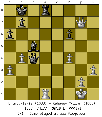 Last move : 0-1 2016 June 28 13:31:20 [Event "FICGS__CHESS__RAPID_E__000171"] [Site "FICGS"] [Date "2016.03.27"] [Round "1"] [White "Bromo,Alexis"] [Black "Kehayov,Yulian"] [Result "0-1"] [WhiteElo "1088"] [BlackElo "1005"] 1.d4 d5 2.c4 c6 3.Nf3 dxc4 4.Nc3 e6 5.e4 f6 6.Bxc4 Nd7 7.Bxe6 Nb8 8.Bxg8 Rxg8 9.h3 Be6 10.O-O Nd7 11.Re1 Qc7 12.a3 O-O-O 13.d5 cxd5 14.exd5 Bf7 15.Nb5 Qb6 16.Nfd4 a6 17.Nc3 Ne5 18.b4 Bxd5 19.Nxd5 Rxd5 20.Qc2+ Kb8 21.Be3 Rxd4 22.Bxd4 Qxd4 23.Rad1 Qb6 24.Re4 Bd6 25.Red4 Rd8 26.Qxh7 Qc7 27.f4 Nc4 28.Rxc4 Qxc4 29.Qxg7 Bc5+ 0-1 QGD Slav : 3.Nf3 Kingside Castling by player White (move 10) Queenside Castling by player Black (move 12) Player Black won this chess game. Follow this game move after move (download)The passed pawn is a criminal, who should be kept under lock and key. Mild measures, such as police surveillance, are not sufficient. (Nimzovitch) Smyslow ist ein Beweis dafür, dass ich noch zehn Jahre spielen kann! [der 75 jährige über den 85 jährigen] (Viktor Kortschnoi) Si el ingenio solamente fuese necesario para lucirse, las mujeres serían las mejores jugadoras de Ajedrez del mundo. (Albin) La victoire dans une partie d'Echecs appartient la plupart du temps à celui qui voit un peu plus loin que l'adversaire. (Lasker) No, no, you're not thinking; you're just being logical. (Niels Bohr)