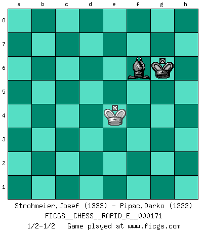 Last move : 1/2-1/2 2016 August 27 0:30:51 [Event "FICGS__CHESS__RAPID_E__000171"] [Site "FICGS"] [Date "2016.03.27"] [Round "1"] [White "Strohmeier,Josef"] [Black "Pipac,Darko"] [Result "1/2-1/2"] [WhiteElo "1333"] [BlackElo "1222"] 1.e4 e5 2.Nf3 Nc6 3.Bb5 d6 4.d4 exd4 5.Nxd4 Nf6 6.Nc3 Bd7 7.Bg5 Nxd4 8.Qxd4 Bxb5 9.O-O-O c5 10.Bxf6 Qxf6 11.Qxf6 gxf6 12.Nxb5 Kd7 13.Rd5 a6 14.Nc3 Rg8 15.g3 Rg5 16.Rhd1 Re8 17.f3 R8e5 18.f4 Rxd5 19.Nxd5 Rg6 20.Nb6+ Kc6 21.Nd5 Rh6 22.Rd2 b5 23.c3 f5 24.exf5 a5 25.b4 axb4 26.cxb4 Kb7 27.a3 Kc6 28.Ne3 Rf6 29.Kc2 h5 30.Nd5 Rh6 31.Kb3 h4 32.g4 h3 33.g5 Rh5 34.f6 Rh4 35.Kc3 Rg4 36.Ne7+ Kd7 37.Nd5 Rg2 38.Ne3 Rxd2 39.Kxd2 cxb4 40.axb4 Ke6 41.Kc3 d5 42.Kd4 Bxb4 43.Nxd5 Be1 44.Nc7+ Kf5 45.Nxb5 Bf2+ 46.Kd3 Bg1 47.Nd6+ Kg6 48.Ke2 Bxh2 49.Kf3 Bxf4 50.Ne4 h2 51.Kg2 Bxg5 52.Kxh2 Bxf6 53.Kg3 Be5+ 54.Kg4 f5+ 55.Kf3 fxe4+ 56.Kxe4 Bf6 1/2-1/2 Ruy Lopez : Old Steinitz defense Queenside Castling by player White (move 9) 10 pieces endgame at move 45 : White KNPPPP , Black KBPP WHITE : King + 1 Knight 4 Pawns BLACK : King + 1 Bishop 2 Pawns 9 pieces endgame at move 48 : White KNPPP , Black KBPP WHITE : King + 1 Knight 3 Pawns BLACK : King + 1 Bishop 2 Pawns 8 pieces endgame at move 49 : White KNPP , Black KBPP WHITE : King + 1 Knight 2 Pawns BLACK : King + 1 Bishop 2 Pawns 7 pieces endgame at move 51 : White KNP , Black KBPP WHITE : King + 1 Knight 1 Pawn BLACK : King + 1 Bishop 2 Pawns 6 pieces endgame at move 52 : White KNP , Black KBP WHITE : King + 1 Knight 1 Pawn BLACK : King + 1 Bishop 1 Pawn 5 pieces endgame at move 52 : White KN , Black KBP WHITE : King + 1 Knight BLACK : King + 1 Bishop 1 Pawn 4 pieces endgame at move 55 : White K , Black KBP WHITE : King + BLACK : King + 1 Bishop 1 Pawn 3 pieces endgame at move 56 : White K , Black KB WHITE : King + BLACK : King + 1 Bishop This chess game ended in a draw. Follow this game move after move (download)Adequate compensation for a sacrifice is having a sound combination leading to a winning position; adequate compensation for a blunder is having your opponent snatch defeat from the jaws of victory. (Bruce A. Moon) Schach ist gnadenlos. Du mußt bereit sein zu töten. (Nigel Short) Después de la respuesta de las negras a 1.e4 con 1..e5, se quedan siempre tratando de entrar dentro del juego. (Howard Staunton) Tout change constamment, y compris dans le monde des Echecs. (Botvinnik) The right perception of any matter and a misunderstanding of the same matter do not wholly exclude each other. (Kafka's the trial)