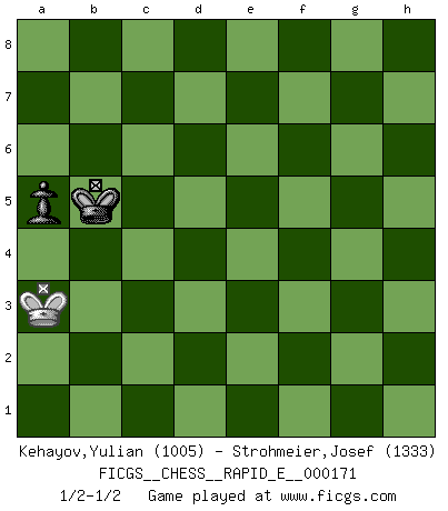 Last move : 1/2-1/2 2016 September 18 11:48:5 [Event "FICGS__CHESS__RAPID_E__000171"] [Site "FICGS"] [Date "2016.03.27"] [Round "1"] [White "Kehayov,Yulian"] [Black "Strohmeier,Josef"] [Result "1/2-1/2"] [WhiteElo "1005"] [BlackElo "1333"] 1.e4 c5 2.d4 cxd4 3.Qxd4 Nc6 4.Qd1 Nf6 5.Bd3 g6 6.Nf3 Bg7 7.Nc3 d6 8.O-O O-O 9.h3 Bd7 10.Nd5 e6 11.Nxf6+ Bxf6 12.c3 Bg7 13.Be3 a6 14.b3 Qc7 15.Nd4 Ne5 16.Be2 Qxc3 17.Qc2 Rac8 18.Qxc3 Rxc3 19.Rfc1 Rfc8 20.Bd2 Rxc1+ 21.Rxc1 Nc6 22.Nxc6 Rxc6 23.Rxc6 Bxc6 24.f3 Bd4+ 25.Kf1 d5 26.exd5 Bxd5 27.Ke1 f5 28.g4 Kg7 29.g5 e5 30.h4 e4 31.fxe4 Bxe4 32.h5 b5 33.a4 bxa4 34.bxa4 Bb7 35.a5 Be5 36.Kf2 Bd4+ 37.Be3 Bxe3+ 38.Kxe3 gxh5 39.Bxh5 Kf8 40.g6 hxg6 41.Bxg6 Bc8 42.Kf4 Ke7 43.Bxf5 Bxf5 44.Kxf5 Kd6 45.Ke4 Kc5 46.Kd3 Kb5 47.Kc3 Kxa5 48.Kb3 Kb5 49.Ka3 a5 1/2-1/2 Sicilian : Smith-Morra gambit Kingside Castling by player White (move 8) Kingside Castling by player Black (move 8) 10 pieces endgame at move 38 : White KBPP , Black KBPPPP WHITE : King + 1 Bishop 2 Pawns BLACK : King + 1 Bishop 4 Pawns 9 pieces endgame at move 39 : White KBPP , Black KBPPP WHITE : King + 1 Bishop 2 Pawns BLACK : King + 1 Bishop 3 Pawns 8 pieces endgame at move 40 : White KBP , Black KBPPP WHITE : King + 1 Bishop 1 Pawn BLACK : King + 1 Bishop 3 Pawns 7 pieces endgame at move 41 : White KBP , Black KBPP WHITE : King + 1 Bishop 1 Pawn BLACK : King + 1 Bishop 2 Pawns 6 pieces endgame at move 43 : White KBP , Black KBP WHITE : King + 1 Bishop 1 Pawn BLACK : King + 1 Bishop 1 Pawn 5 pieces endgame at move 43 : White KP , Black KBP WHITE : King + 1 Pawn BLACK : King + 1 Bishop 1 Pawn 4 pieces endgame at move 44 : White KP , Black KP WHITE : King + 1 Pawn BLACK : King + 1 Pawn 3 pieces endgame at move 47 : White K , Black KP WHITE : King + BLACK : King + 1 Pawn This chess game ended in a draw. Follow this game move after move (download)For surely of all the drugs in the world, Chess must be the most permanently pleasurable. (Assiac) Schach wird sich dank seiner hohen kulturellen Tradition immer durchsetzen. In näherer Zukunft womöglich sogar als Gegenreaktion auf die maßlose Reizüberflutung im Freizeit- und Spielbereich. (Garry Kasparov) El Ajedrez se juega con la mente... ¡no con las manos!. (Renaud y Kahn) On peut tirer plus d'utilité d'une partie perdue que de 100 parties gagnées. (Capablanca) They misunderestimated me. (George W. Bush, Bentonville nov. 6, 2000)