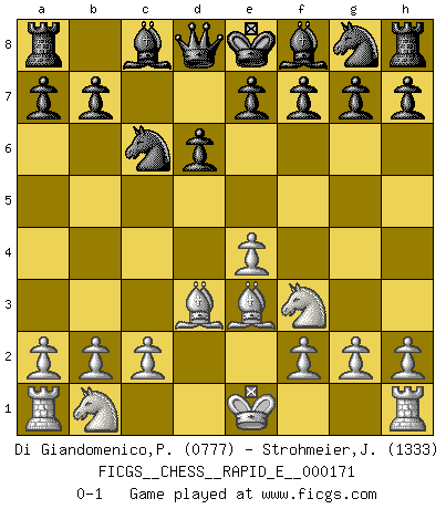 Last move : 0-1 2016 June 24 11:30:14 [Event "FICGS__CHESS__RAPID_E__000171"] [Site "FICGS"] [Date "2016.03.27"] [Round "1"] [White "Di Giandomenico,Pierino"] [Black "Strohmeier,Josef"] [Result "0-1"] [WhiteElo "0777"] [BlackElo "1333"] 1.e4 c5 2.d4 cxd4 3.Qxd4 Nc6 4.Bd3 Nxd4 5.Be3 Nc6 6.Nf3 d6 0-1 This chess game has been lost on time (started : 2016.03.27 19:28:57) Sicilian : Smith-Morra gambit Player Black won this chess game. Follow this game move after move (download)The isolated Pawn casts gloom over the entire chessboard. (Aaron Nimzovich) Wir können eben der zündenden Macht des Opfers nicht wiederstehen, denn die Begeisterung für das Opfer liegt in der Natur des Menschen. (Rudolf Spielmann) Realmente no sabemos como el juego fue inventado, aunque hay sospechas. Tan pronto como descubramos a los culpables, se los haremos saber. (Bruce Pandolfini) Aux échecs, les retours au sommet sont rares : les dommages psychologiques consécutifs à une défaite sont trop sévères. (Daily Telegraph) Winning isn't everything... but losing is nothing. (Mednis)