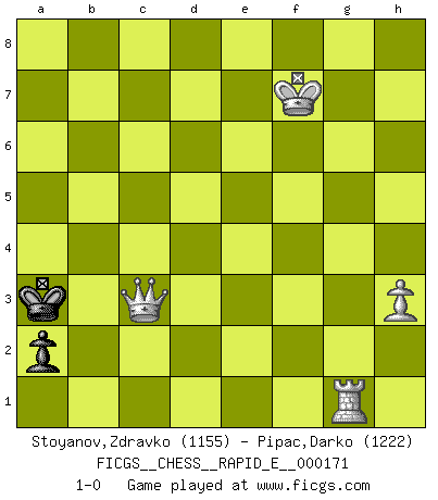 Last move : 1-0 2016 June 16 21:33:49 [Event "FICGS__CHESS__RAPID_E__000171"] [Site "FICGS"] [Date "2016.03.27"] [Round "1"] [White "Stoyanov,Zdravko"] [Black "Pipac,Darko"] [Result "1-0"] [WhiteElo "1155"] [BlackElo "1222"] 1.e4 e5 2.Nf3 Nc6 3.Bb5 d6 4.Bxc6+ bxc6 5.h3 Nf6 6.d3 h6 7.a3 Qe7 8.O-O d5 9.exd5 cxd5 10.Re1 e4 11.Nc3 Bf5 12.Nd4 Bg6 13.dxe4 dxe4 14.f3 O-O-O 15.Ncb5 Qc5 16.fxe4 Bxe4 17.Be3 Qb6 18.Qe2 Bc5 19.b4 Bxd4 20.Bxd4 Rxd4 21.Nxd4 Qxd4+ 22.Kh1 Re8 23.Rad1 Qb6 24.Qc4 Qe6 25.Qxe6+ Rxe6 26.Kh2 Bxc2 27.Rxe6 Bxd1 28.Re7 Bb3 29.Re3 Ba4 30.Kg3 h5 31.Re5 Bb3 32.Ra5 Kb7 33.Kf4 g6 34.a4 c6 35.b5 Kb6 36.Ra6+ Kb7 37.Rxc6 Nd5+ 38.Kg5 Nb6 39.Rf6 Nxa4 40.Rf3 Kb6 41.Rxb3 Nc5 42.Ra3 Nb7 43.Rb3 Nd6 44.Kf6 Kc7 45.Ke7 Nf5+ 46.Kxf7 Nd6+ 47.Kxg6 Kb6 48.Kxh5 Nxb5 49.g4 a5 50.g5 a4 51.Rb1 Ka5 52.g6 Nd6 53.g7 Ne8 54.Kh6 Nf6 55.Kg6 Nd5 56.Kf7 a3 57.g8Q a2 58.Ra1 Nc3 59.Qa8+ Kb4 60.Qb7+ Ka3 61.Rg1 Ne2 62.Qf3+ Nc3 63.Qxc3+ 1-0 Ruy Lopez : Old Steinitz defense Kingside Castling by player White (move 8) Queenside Castling by player Black (move 14) 10 pieces endgame at move 46 : White KRPPP , Black KNPPP WHITE : King + 1 Rook 3 Pawns BLACK : King + 1 Knight 3 Pawns 9 pieces endgame at move 47 : White KRPPP , Black KNPP WHITE : King + 1 Rook 3 Pawns BLACK : King + 1 Knight 2 Pawns 8 pieces endgame at move 48 : White KRPPP , Black KNP WHITE : King + 1 Rook 3 Pawns BLACK : King + 1 Knight 1 Pawn 7 pieces endgame at move 48 : White KRPP , Black KNP WHITE : King + 1 Rook 2 Pawns BLACK : King + 1 Knight 1 Pawn Promotion Queen by player White (move 57) 6 pieces endgame at move 63 : White KQRP , Black KP WHITE : King + 1 Queen 1 Rook 1 Pawn BLACK : King + 1 Pawn Player White won this chess game. Follow this game move after move (download)With or without the title, Bobby Fischer was unquestionably the greatest player of his time. (Burt Hochberg) Im Schach gewinnt jeder. Hat man Freunde am Spiel - und das ist die Hauptsache - ist auch der Verlust einer Partie kein Unglück. (David Bronstein) Una partida de Ajedrez se divide en 3 etapas: la primera cuando piensas que tienes la ventaja, la segunda cuando crees que tienes la ventaja y la tercera... ¡cuando te das cuenta que vas a perder!. (Savielly Tartakower) Toutes les manuvres exécutées sur une colonne ouverte ont pour but ultime l'intrusion définitive sur la septième ou la huitième rangée, en plein cur de la position ennemie. (Aaron Nimzovitch) War is the child of passion, passion is the child of narcissism and narcissism is the child. (...) Another game ? (Thibault de Vassal)