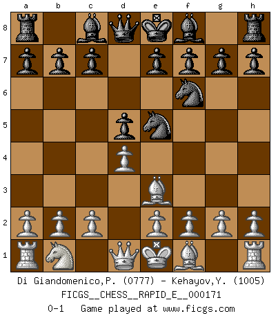 Last move : 0-1 2016 June 19 11:20:3 [Event "FICGS__CHESS__RAPID_E__000171"] [Site "FICGS"] [Date "2016.03.27"] [Round "1"] [White "Di Giandomenico,Pierino"] [Black "Kehayov,Yulian"] [Result "0-1"] [WhiteElo "0777"] [BlackElo "1005"] 1.d4 d5 2.Be3 Nc6 3.Nf3 Nf6 4.Ne5 Nxe5 0-1 This chess game has been lost on time (started : 2016.03.27 19:28:57) Queen's pawn game Player Black won this chess game. Follow this game move after move (download)Bobby Fischer is the greatest Chess player who has ever lived. (Ken Smith) Ich würde mich als ganz normalen Jungen bezeichnen [Im Alter von 12]. (Sergej Karjakin) Para mi, el Ajedrez es la vida y cada partida es como una nueva vida. Todo jugador de Ajedrez suele vivir muchas vidas durante su vida. (Eduard Gufeld) Les Echecs ont trois composantes : le temps, l'espace et le matériel en dernier. (Mikhail Tal) The only sure thing about luck is that it will change. (Wilson Mizner)