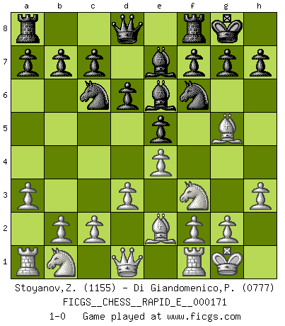 Last move : 1-0 2016 June 16 23:2:30 [Event "FICGS__CHESS__RAPID_E__000171"] [Site "FICGS"] [Date "2016.03.27"] [Round "1"] [White "Stoyanov,Zdravko"] [Black "Di Giandomenico,Pierino"] [Result "1-0"] [WhiteElo "1155"] [BlackElo "0777"] 1.e4 e5 2.Nf3 Nf6 3.d3 d6 4.h3 Be7 5.Be2 O-O 6.O-O Be6 7.a3 Nc6 8.Bg5 1-0 This chess game has been lost on time (started : 2016.03.27 19:28:57) Petrov's defense Kingside Castling by player Black (move 5) Kingside Castling by player White (move 6) Player White won this chess game. Follow this game move after move (download)Different people feel differently about resigning. (Bobby Fischer) Um sich vor der Gefahr einer Erkältung zu schützen, sorge der wanderlustige König beizeiten für ein brauchbares Versteck. (Aaron Nimzowitsch) Yo he agregado estos principios a la ley: pongan los Caballos en acción antes de que los dos Alfiles sean desarrollados. (Emanuel Lasker) Le système Elo représente seulement une moyenne. Il est simplement un indicateur de votre stabilité. (Anatoli Karpov) Thus, what is of supreme importance in war is to attack the enemy's strategy. (Sun Tzu)