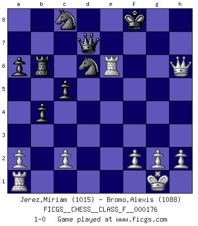 Last move : 1-0 2016 September 17 10:6:48 [Event "FICGS__CHESS__CLASS_F__000176"] [Site "FICGS"] [Date "2016.03.27"] [Round "1"] [White "Jerez,Miriam"] [Black "Bromo,Alexis"] [Result "1-0"] [WhiteElo "1015"] [BlackElo "1088"] 1.e4 e5 2.Nf3 Nc6 3.Nc3 a6 4.d4 d6 5.d5 Na7 6.Bc4 h6 7.O-O Nf6 8.b4 b5 9.Bb3 c5 10.bxc5 dxc5 11.Nxe5 b4 12.Ne2 Nxe4 13.Nf4 Bd6 14.Re1 Bf5 15.Bb2 Bxe5 16.Bxe5 O-O 17.Nh5 f6 18.d6 Kh7 19.Qd3 fxe5 20.Bc4 Nxd6 21.Qg3 g5 22.Bd5 Rb8 23.Qxe5 Qd7 24.Nf6+ Rxf6 25.Qxf6 Nac8 26.Be6 Bxe6 27.Rxe6 Rb6 28.Qxh6+ Kg8 29.Qxg5+ Kf8 30.Qh6+ 1-0 Three knights game Kingside Castling by player White (move 7) Kingside Castling by player Black (move 16) Player White won this chess game. Follow this game move after move (download)In Chess, at least, the brave inherit the earth. (Edmar Mednis) Du musst nicht gut spielen, es reicht, wenn du besser spielst als dein Gegner. (Anonymous) Uno no tiene que jugar muy bien, es suficiente jugar mejor que el oponente. (Siegbert Tarrasch) Les Echecs ne sont pas pour les âmes timides. Ils requièrent un homme entier, qui ne s'arrête pas aveuglément à ce qui a été déjà établi, mais qui tente individuellement de sonder les profondeurs du jeu. (W. Steinitz) I believe in luck. How else can you explain the success of those you dislike ? (Jean Cocteau)