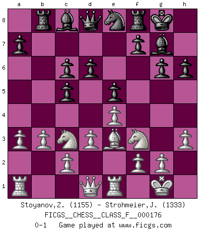 Last move : 0-1 2016 August 17 8:6:50 [Event "FICGS__CHESS__CLASS_F__000176"] [Site "FICGS"] [Date "2016.03.27"] [Round "1"] [White "Stoyanov,Zdravko"] [Black "Strohmeier,Josef"] [Result "0-1"] [WhiteElo "1155"] [BlackElo "1333"] 1.e4 c5 2.Nf3 Nc6 3.Bb5 g6 4.Bxc6 bxc6 5.h3 Bg7 6.O-O d6 7.Re1 Nf6 8.a3 O-O 9.Nc3 e5 10.d3 h6 11.Be3 Rb8 12.b3 Ne8 0-1 Sicilian : Nimzovich-Rossolimo attack (with ...g6, without ...d6) Kingside Castling by player White (move 6) Kingside Castling by player Black (move 8) Player Black won this chess game. Follow this game move after move (download)The beauty of a move lies not in its' appearance but in the thought behind it. (Siegbert Tarrasch) Smyslow ist ein Beweis dafür, dass ich noch zehn Jahre spielen kann! [der 75 jährige über den 85 jährigen] (Viktor Kortschnoi) Fischer sacrificó virtualmente todo lo que la mayoría de nosotros los 'debiles' (término que él usa) valoramos, respetamos y apreciamos por el amor de un astuto, a menudo hermoso tablero de juego, por el privilegio ambivalente de ser su mas grande maestro. (Paul Kollar) Les Echecs représentent une sphère d'idées créatrices basée sur la volonté des deux protagonistes. (Smyslov) Big Chess is a place for big hallucinations. (Thibault de Vassal)