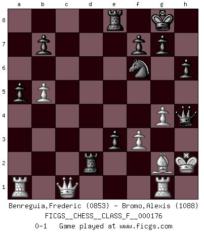 Last move : 0-1 2016 April 13 0:6:36 [Event "FICGS__CHESS__CLASS_F__000176"] [Site "FICGS"] [Date "2016.03.27"] [Round "1"] [White "Benreguia,Frederic"] [Black "Bromo,Alexis"] [Result "0-1"] [WhiteElo "0853"] [BlackElo "1088"] 1.b4 e5 2.a3 d5 3.d3 Nf6 4.Bb2 Bd6 5.c3 Bf5 6.g3 Nbd7 7.Bg2 c6 8.h3 O-O 9.Nf3 Re8 10.c4 d4 11.O-O c5 12.bxc5 Nxc5 13.g4 Bg6 14.a4 a5 15.Nh2 e4 16.f3 e3 17.Bxd4 Bxh2+ 18.Kxh2 Qxd4 19.Na3 Qf4+ 20.Kg1 Rad8 21.h4 h6 22.Bh3 Qg3+ 23.Bg2 Qxh4 24.Nb5 Nxd3 25.exd3 Bxd3 26.Re1 Bxc4 27.Qc1 Qf2+ 28.Kh2 Bxb5 29.axb5 Rd2 30.Rg1 Qh4+ 0-1 Polish (Sokolsky) opening Kingside Castling by player Black (move 8) Kingside Castling by player White (move 11) Player Black won this chess game. Follow this game move after move (download)The winner of the game is the player who makes the next-to-last mistake. (Savielly Tartakover) Der Bart als Geschlechtszeichen mitten im Gesicht ist obszön. Daher gefällt er den Weibern. [Zugegeben, kein Schachzitat, aber unglaublich originell] (Arthur Schopenhauer) El juego de Damas es para vagabundos. (Paul Morphy) Les Echecs ont trois composantes : le temps, l'espace et le matériel en dernier. (Mikhail Tal) Luck is what you have left over after you give 100 percent. (Langston Coleman)