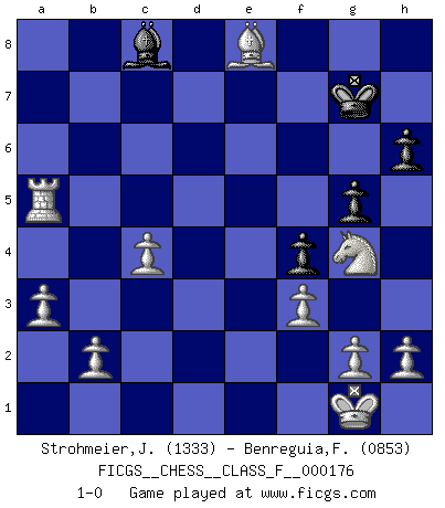 Last move : 1-0 2016 July 28 22:14:29 [Event "FICGS__CHESS__CLASS_F__000176"] [Site "FICGS"] [Date "2016.03.27"] [Round "1"] [White "Strohmeier,Josef"] [Black "Benreguia,Frederic"] [Result "1-0"] [WhiteElo "1333"] [BlackElo "0853"] 1.e4 e6 2.d4 g6 3.Nf3 Bg7 4.Be2 Ne7 5.O-O c6 6.Nc3 O-O 7.Be3 b5 8.a3 a5 9.Qd2 f5 10.Bf4 a4 11.e5 Na6 12.Bh6 Bb7 13.Bxg7 Kxg7 14.Rfe1 d6 15.exd6 Qxd6 16.Ne5 h6 17.Rad1 c5 18.Bxb5 cxd4 19.Qxd4 Qxd4 20.Rxd4 Nc5 21.Nxa4 Nxa4 22.Bxa4 g5 23.Rd7 Bc8 24.Rxe7+ Kf6 25.Re8 Rxe8 26.Bxe8 Bb7 27.Bb5 f4 28.f3 Ra5 29.Ng4+ Kg6 30.Rxe6+ Kf5 31.Re5+ Kg6 32.Be8+ Kg7 33.Rxa5 Bc8 34.c4 1-0 French defense Kingside Castling by player White (move 5) Kingside Castling by player Black (move 6) Player White won this chess game. Follow this game move after move (download)The game of Chess is not merely an idle amusement; several very valuable qualities of the mind are to be acquired and strengthened by it, so as to become habits ready on all occasions; for life is a kind of Chess. (Benjamin Franklin) Obendrein hat der FIDE-Präsident den Revolutionsführer Gaddafi zum »Großmeister« ernannt, am Ende der WM. Das ist lächerlich! (Joel Lautier) Todos los Maestros de Ajedrez fueron un día unos principiantes. (Chernev) Il (Jacob Murray) ne joue pas pour le bon coup, mais pour le meilleur. (Eloi Relange) Over-the-board chess is the favorite of mortals, correspondence chess is the favorite of the gods. (Eduard Dyckhoff)