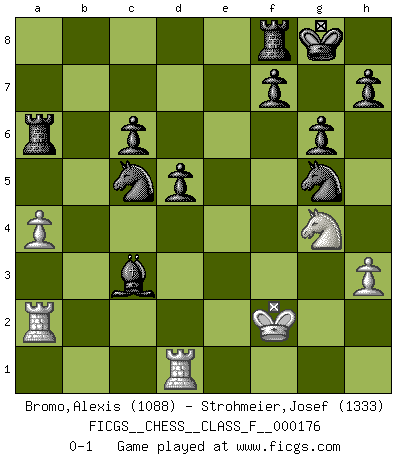 Last move : 0-1 2016 July 10 9:57:52 [Event "FICGS__CHESS__CLASS_F__000176"] [Site "FICGS"] [Date "2016.03.27"] [Round "1"] [White "Bromo,Alexis"] [Black "Strohmeier,Josef"] [Result "0-1"] [WhiteElo "1088"] [BlackElo "1333"] 1.d4 Nf6 2.c4 g6 3.Nc3 Bg7 4.e3 O-O 5.Nf3 d6 6.h3 c6 7.Be2 Nbd7 8.O-O e5 9.Re1 e4 10.Nh2 d5 11.c5 b6 12.b4 a5 13.bxa5 bxc5 14.Ba3 Qxa5 15.Qc1 Qxa3 16.Qxa3 Rxa3 17.Rec1 cxd4 18.exd4 Ba6 19.Bxa6 Rxa6 20.a4 Ne8 21.Rd1 Nd6 22.Ng4 Nf5 23.Ra2 Nxd4 24.Ne3 Nc5 25.f3 exf3 26.gxf3 Nxf3+ 27.Kf2 Ng5 28.Ng4 Bxc3 0-1 King's Indian defense, 3.Nc3 Kingside Castling by player Black (move 4) Kingside Castling by player White (move 8) Player Black won this chess game. Follow this game move after move (download)In Fischer's hands, a slight theoretical advantage is as good a being a Queen ahead. (Isaac Kashdan) Kasparov stellt für gewöhnlich die Regeln auf und bricht sie dann selbst wieder. (Alexej Shirov) La captura del Rey enemigo es la finalidad pero no el primer objetivo de la partida. (William Steinitz) Même si l'adversaire joue le coup analysé précédemment, recommencez l'analyse en voyant la nouvelle position. Première règle de Blumenfeld Unless in communicating with it one says exactly what one means, trouble is bound to result. (Alan Turing, about computers)