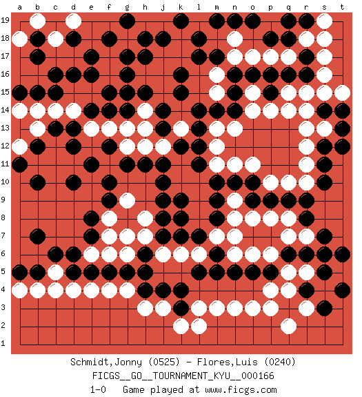 Last move : 1-0 2016 October 18 20:33:35 [Event "FICGS__GO__TOURNAMENT_KYU__000166"] [Site "FICGS"] [Date "2016.03.31"] [Round "1"] [Black "Schmidt,Jonny"] [White "Flores,Luis"] [Result "1-0"] [Rating 1 "0525"] [Rating 2 "0240"] 1.d16 d4 2.q16 q4 3.e5 e4 4.f5 f4 5.g5 g4 6.h4 h3 7.d10 q10 8.p5 p6 9.o5 o6 10.n5 n6 11.m6 m7 12.j4 j3 13.k3 k2 14.l5 l3 15.k4 m3 16.k16 k10 17.j11 j12 18.h11 k11 19.j13 h12 20.g11 g12 21.f12 f13 22.e11 h13 23.g14 h14 24.j14 j15 25.k15 j16 26.f14 g15 27.g16 h16 28.f15 f16 29.g17 f17 30.h17 j17 31.h15 g13 32.g15 k17 33.l17 k18 34.l18 l19 35.j18 j19 36.h18 h19 37.g19 g18 38.f18 l6 39.m5 q5 40.l7 k6 41.k7 j6 42.m8 n7 43.j7 h7 44.h6 g6 45.h5 g7 46.e7 n8 47.k12 e13 48.e16 k13 49.k19 p17 50.l12 r15 51.p16 q17 52.o16 l8 53.m9 l9 54.m10 l10 55.j8 h8 56.j9 g9 57.j10 m11 58.n10 n11 59.o10 o11 60.l11 p10 61.k8 m12 62.k9 n9 63.f10 l2 64.d13 d14 65.d12 c14 66.e14 n3 67.l13 m13 68.m14 m15 69.n14 o14 70.n15 m16 71.n16 n17 72.m17 o17 73.m19 n13 74.e8 f8 75.f9 f7 76.d5 o3 77.c13 o15 78.r17 r18 79.r16 q15 80.p15 p14 81.q19 s17 82.o19 s16 83.l14 c5 84.c6 c4 85.r19 s18 86.q18 n18 87.n19 s19 88.o9 o8 89.p9 p8 90.q9 q8 91.r9 r10 92.r8 r7 93.s7 s6 94.r6 q7 95.s5 p4 96.t6 p3 97.q6 r5 98.s10 r11 99.s11 r12 100.c15 b14 101.b15 b13 102.b12 a12 103.a11 a14 104.b10 b16 105.c16 a16 106.b17 a17 107.b18 a18 108.a19 b19 109.a15 c18 110.a19 a18 111.d18 d19 112.e17 s15 113.s6 s4 114.b5 b4 115.a5 a4 116.s12 s13 117.t13 r13 118.t14 t15 119.s14 q14 120.b7 r14 121.t12 e6 122.d6 f6 123.t4 r3 124.s3 q2 125.r4 p19 126.p18 1-0 Here are the names of the openings (joseki) played in the four corners : Corner d4 : d4 e5 Hoshi (Hwajeom, Seongjeom, Xingwei`) 4-4 Point. The star or hoshi (4-4) point, emphasizing influence at the potential expense of territory. Corner q4 : q4 p5 Hoshi (Hwajeom, Seongjeom, Xingwei`) 4-4 Point. The star or hoshi (4-4) point, emphasizing influence at the potential expense of territory. Player Black won this Go (weiqi, baduk) game. Follow this game move after move (download)Studying go is a wonderful way to develop both the creative as well as the logical abilities of children because to play it both sides of the brain are necessary. (Cho Chikun) Political correctness is subjecting us to gross incompetence. (Johann Piek)