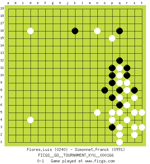 Last move : 0-1 2016 June 11 23:51:3 [Event "FICGS__GO__TOURNAMENT_KYU__000166"] [Site "FICGS"] [Date "2016.03.31"] [Round "1"] [Black "Flores,Luis"] [White "Simonnet,Franck"] [Result "0-1"] [Rating 1 "0240"] [Rating 2 "0991"] 1.q16 d4 2.q4 d16 3.k16 r6 4.q8 q10 5.p9 r9 6.p10 q11 7.p11 r8 8.o8 p5 9.p7 n5 10.q6 q5 11.r5 s5 12.s4 r4 13.r3 p4 14.p3 s3 15.t4 q3 16.r2 s2 17.s1 q2 18.r1 q1 19.t1 t5 20.t2 t3 21.q12 n16 22.r11 p15 23.r10 q9 24.r7 s7 25.s8 q7 0-1 Here are the names of the openings (joseki) played in the four corners : Corner q4 : q4 r6 Hoshi (Hwajeom, Seongjeom, Xingwei`) 4-4 Point. The star or hoshi (4-4) point, emphasizing influence at the potential expense of territory. Ikken Kakari (Hankan Keolch'im, Yi Gua`jiao~, 1-Space Low Approach). White 2 is the standard approach move to the 4-4. Corner q16 : q16 q11 Hoshi (Hwajeom, Seongjeom, Xingwei`) 4-4 Point. The star or hoshi (4-4) point, emphasizing influence at the potential expense of territory. Player White won this Go (weiqi, baduk) game. Follow this game move after move (download)Everything happens on a grid-engraved board with black and white pieces, but if that's all you see then you don't know Go. (Pierre Audouard) Tomorrow's what you make of it. (Horatio Caine, C.S.I. Miami)