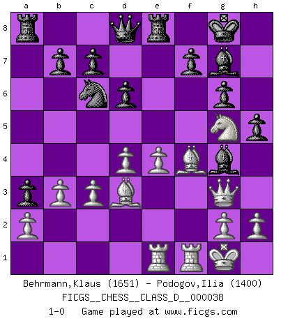 Last move : 1-0 2007 June 10 6:57:10 [Event "FICGS__CHESS__CLASS_D__000038"] [Site "FICGS"] [Date "2007.03.25"] [Round "1"] [White "Behrmann,Klaus"] [Black "Podogov,Ilia"] [Result "1-0"] [WhiteElo "1651"] [BlackElo "1400"] 1.e4 e5 2.f4 d6 3.Nf3 Nf6 4.Nc3 Nc6 5.Bb5 exf4 6.d3 Nh5 7.O-O g6 8.Nd5 Bg7 9.c3 O-O 10.Nxf4 Nxf4 11.Bxf4 Bg4 12.d4 Qe8 13.Bd3 a5 14.Qe1 a4 15.Qh4 h5 16.Rae1 a3 17.b3 Qd8 18.Qg3 Re8 19.Ng5 1-0 King's gambit Kingside Castling by player White (move 7) Kingside Castling by player Black (move 9) Player White won this chess game. Follow this game move after move (download)No Chess Grandmaster is normal; they only differ in the extent of their madness. (Viktor Korchnoi) Ein Gewinn durch eine ungenaue Kombination, sei sie auch noch so vorzeigbar, erfüllt mich mit Schaudern. (Wilhelm Steinitz) Evita las multitudes. Haz independientemente tu propio razonamiento. Trata de ser el jugador de Ajedrez, no la pieza de Ajedrez. (Ralph Charell) La vérité est comme le meilleur coup aux échecs : elle existe, mais il faut la chercher. (Arturo Perez-Reverte) Strategy without tactics is the slowest route to victory. Tactics without strategy is the noise before defeat. (Sun Tzu)
