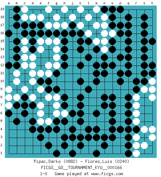 Last move : 1-0 2016 August 17 22:11:4 [Event "FICGS__GO__TOURNAMENT_KYU__000166"] [Site "FICGS"] [Date "2016.03.31"] [Round "1"] [Black "Pipac,Darko"] [White "Flores,Luis"] [Result "1-0"] [Rating 1 "0882"] [Rating 2 "0240"] 1.d4 d16 2.q16 q4 3.m4 q10 4.k10 d10 5.k16 k4 6.k5 j5 7.l4 l5 8.k6 l6 9.k7 l7 10.k8 l8 11.l9 m9 12.m10 n10 13.j6 h6 14.h7 g7 15.j4 k3 16.h5 g6 17.h8 g8 18.g9 f8 19.e10 e9 20.f9 e7 21.g5 f5 22.f4 e6 23.e4 e11 24.f10 f11 25.g11 g12 26.h12 f12 27.h13 g13 28.h14 g14 29.n11 o11 30.m12 n12 31.m11 m13 32.l13 l14 33.k14 m15 34.k12 l16 35.k15 k17 36.j17 j18 37.h18 h17 38.j16 g18 39.h16 g17 40.g16 h19 41.l15 g15 42.f16 f15 43.e17 f17 44.e16 e15 45.d17 e18 46.c17 d18 47.c16 c15 48.d15 b16 49.b15 c14 50.d14 d13 51.b17 e14 52.d16 d12 53.b14 c13 54.b13 c12 55.h15 d11 56.m14 n14 57.n13 o13 58.o12 p12 59.n12 m5 60.o14 n15 61.p13 m17 62.o15 o16 63.p16 n17 64.o17 n16 65.o18 n18 66.p11 o10 67.q12 n9 68.p10 p9 69.c6 n4 70.l3 l2 71.r10 q9 72.r9 r8 73.q11 c18 74.b18 f19 75.j3 j2 76.k2 k1 77.k3 m2 78.h2 h1 79.g1 g2 80.j1 l1 81.f2 g3 82.g4 f3 83.e3 e5 84.d5 d8 85.n3 n5 86.n2 o2 87.o3 p2 88.p4 p3 89.o4 p5 90.m3 n1 91.h3 p1 92.m1 o1 93.o5 p6 94.o6 p7 95.o7 p8 96.o8 o9 97.n7 m8 98.q3 r3 99.q2 r2 100.q1 r1 101.r4 r5 102.q5 r6 103.q6 r7 104.q4 s9 105.q7 s4 106.q8 r11 107.s10 t10 108.s11 r12 109.s12 r13 110.s13 r14 111.s14 r15 112.s15 r16 113.s16 r17 114.s17 r18 115.p17 q19 116.m6 m7 117.n8 n6 118.m6 r19 119.s18 s19 120.t9 t8 121.t11 t9 122.p19 t19 123.q18 t18 124.q17 t17 125.q13 t14 126.q15 t13 127.q14 t16 128.t12 t4 129.s3 s2 130.t15 t3 131.n19 l18 132.a16 b11 133.a12 b10 134.b12 c9 135.b19 c19 136.d7 m19 137.o19 k19 138.c8 b8 139.c7 a9 140.b7 a7 141.a6 a8 142.b5 1-0 Here are the names of the openings (joseki) played in the four corners : Corner q4 : q4 m4 Hoshi (Hwajeom, Seongjeom, Xingwei`) 4-4 Point. The star or hoshi (4-4) point, emphasizing influence at the potential expense of territory. Corner d4 : d4 j5 Hoshi (Hwajeom, Seongjeom, Xingwei`) 4-4 Point. The star or hoshi (4-4) point, emphasizing influence at the potential expense of territory. Player Black won this Go (weiqi, baduk) game. Follow this game move after move (download)Do not fear furikawari. (Anonymous) Man with more than one clock never knows what time it is. (Chinese thought)