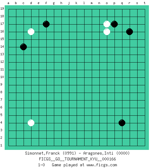 Last move : 1-0 2016 July 2 0:29:23 [Event "FICGS__GO__TOURNAMENT_KYU__000166"] [Site "FICGS"] [Date "2016.03.31"] [Round "1"] [Black "Simonnet,Franck"] [White "Aragones,Inti"] [Result "1-0"] [Rating 1 "0991"] [Rating 2 "0000"] 1.q4 d4 2.r16 d16 3.p17 o16 4.c14 o17 5.f17 1-0 This go game has been lost on time (started : 2016.03.31 20:24:3) Here are the names of the openings (joseki) played in the four corners : Corner d16 : d16 c14 Hoshi (Hwajeom, Seongjeom, Xingwei`) 4-4 Point. The star or hoshi (4-4) point, emphasizing influence at the potential expense of territory. Ikken Kakari (Hankan Keolch'im, Yi Gua`jiao~, 1-Space Low Approach). Black 2 is the standard approach move to the 4-4. Player Black won this Go (weiqi, baduk) game. Follow this game move after move (download)Learn to play under the stones. (Anonymous) The good fighters of old first put themselves beyond the possibility of defeat, and then waited for an opportunity of defeating the enemy. (Sun Tzu)