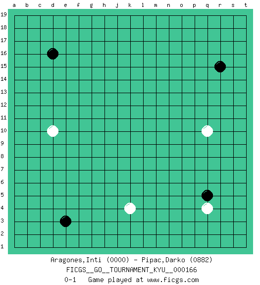 Last move : 0-1 2016 May 31 21:41:33 [Event "FICGS__GO__TOURNAMENT_KYU__000166"] [Site "FICGS"] [Date "2016.03.31"] [Round "1"] [Black "Aragones,Inti"] [White "Pipac,Darko"] [Result "0-1"] [Rating 1 "0000"] [Rating 2 "0882"] 1.d16 q4 2.r15 d10 3.e3 k4 4.q5 q10 0-1 Here are the names of the openings (joseki) played in the four corners : Corner q4 : q4 q5 Hoshi (Hwajeom, Seongjeom, Xingwei`) 4-4 Point. The star or hoshi (4-4) point, emphasizing influence at the potential expense of territory. Player White won this Go (weiqi, baduk) game. Follow this game move after move (download)It is difficult to know exactly what you are doing. (Pierre Audouard) There are 10 types of people in this world: those who understand binary and those who don't. (Anonymous)