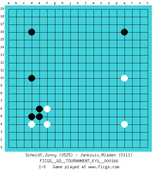 Last move : 1-0 2016 June 23 11:26:57 [Event "FICGS__GO__TOURNAMENT_KYU__000166"] [Site "FICGS"] [Date "2016.03.31"] [Round "1"] [Black "Schmidt,Jonny"] [White "Jankovic,Mladen"] [Result "1-0"] [Rating 1 "0525"] [Rating 2 "0111"] 1.d16 q4 2.q16 d4 3.d10 q10 4.e5 f4 5.d5 f6 6.e6 1-0 This go game has been lost on time (started : 2016.03.31 20:24:3) Here are the names of the openings (joseki) played in the four corners : Corner d4 : d4 e5 Hoshi (Hwajeom, Seongjeom, Xingwei`) 4-4 Point. The star or hoshi (4-4) point, emphasizing influence at the potential expense of territory. Player Black won this Go (weiqi, baduk) game. Follow this game move after move (download)Answer the keima with a kosumi. (Anonymous) Just because you do not take an interest in politics doesn't mean politics won't take an interest in you. (Pericles 430 B.C.)