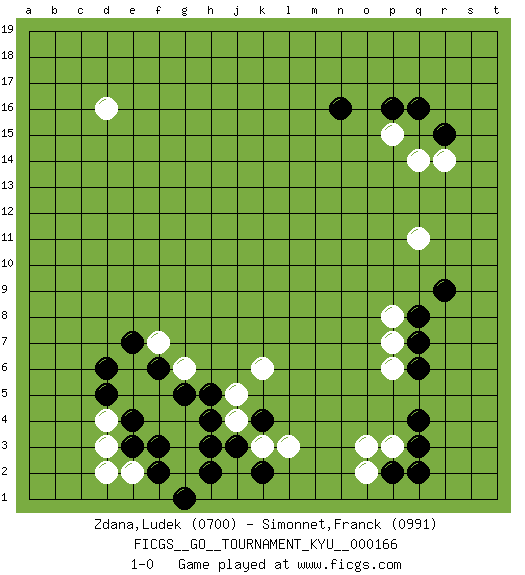 Last move : 1-0 2016 June 17 23:11:13 [Event "FICGS__GO__TOURNAMENT_KYU__000166"] [Site "FICGS"] [Date "2016.03.31"] [Round "1"] [Black "Zdana,Ludek"] [White "Simonnet,Franck"] [Result "1-0"] [Rating 1 "0700"] [Rating 2 "0991"] 1.q16 d4 2.q4 d16 3.r9 r14 4.r15 q14 5.n16 q11 6.q7 o3 7.p2 p3 8.q3 o2 9.q2 p15 10.p16 p6 11.q6 p8 12.q8 p7 13.k4 k6 14.f3 k3 15.j3 j4 16.k2 l3 17.h4 j5 18.h2 e2 19.f2 g4 20.h5 g3 21.h3 g2 22.g1 g6 23.e3 d2 24.g5 f4 25.e4 f5 26.f6 e5 27.d5 e6 28.d6 f7 29.e7 d3 30.f6 1-0 Here are the names of the openings (joseki) played in the four corners : Corner q16 : q16 r14 Hoshi (Hwajeom, Seongjeom, Xingwei`) 4-4 Point. The star or hoshi (4-4) point, emphasizing influence at the potential expense of territory. Ikken Kakari (Hankan Keolch'im, Yi Gua`jiao~, 1-Space Low Approach). White 2 is the standard approach move to the 4-4. Corner d4 : d4 f3 Hoshi (Hwajeom, Seongjeom, Xingwei`) 4-4 Point. The star or hoshi (4-4) point, emphasizing influence at the potential expense of territory. Ikken Kakari (Hankan Keolch'im, Yi Gua`jiao~, 1-Space Low Approach). Black 2 is the standard approach move to the 4-4. Player Black won this Go (weiqi, baduk) game. Follow this game move after move (download)The monkey jump is worth eight points. (Anonymous) Kids, you tried your best and you failed miserably. The lesson is, never try. (Simpsons)