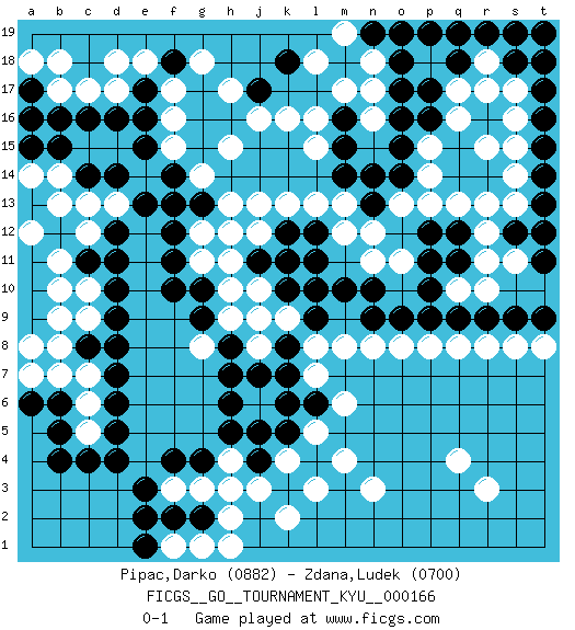 Last move : 0-1 2016 July 31 21:20:32 [Event "FICGS__GO__TOURNAMENT_KYU__000166"] [Site "FICGS"] [Date "2016.03.31"] [Round "1"] [Black "Pipac,Darko"] [White "Zdana,Ludek"] [Result "0-1"] [Rating 1 "0882"] [Rating 2 "0700"] 1.d4 q16 2.p17 q17 3.p16 p15 4.o16 q13 5.o15 p14 6.o14 q10 7.d16 q4 8.m10 k4 9.d10 k16 10.h6 c6 11.b6 b7 12.b5 f3 13.d7 c5 14.c4 c7 15.d8 c9 16.d9 c10 17.c8 b8 18.c11 b11 19.b12 c12 20.d11 b10 21.a11 b13 22.a10 a12 23.a9 a8 24.b4 f17 25.d12 d13 26.j4 j3 27.h3 h4 28.j5 h2 29.d6 k2 30.g4 g3 31.f4 c17 32.e13 k13 33.e3 f15 34.d14 c13 35.e15 f16 36.f14 g14 37.h5 h3 38.d5 k9 39.k10 j10 40.l9 k11 41.l10 j8 42.k8 j9 43.j7 g8 44.h7 g11 45.f12 g12 46.g13 h13 47.f13 h15 48.f11 d17 49.c16 o13 50.c14 b14 51.b15 a14 52.a15 b17 53.b16 l8 54.k7 m8 55.h8 n12 56.n13 m13 57.n14 n17 58.m14 l13 59.q18 r18 60.o18 n18 61.o17 s17 62.r19 q19 63.e17 e18 64.e16 d18 65.f2 l5 66.g10 h10 67.f10 h9 68.g9 h11 69.p19 n16 70.o19 l16 71.m16 m17 72.m15 l18 73.n19 m19 74.s18 r17 75.t18 s19 76.l11 m12 77.k12 j13 78.j11 h12 79.n9 n8 80.o9 o8 81.p9 p8 82.q9 q8 83.r9 r8 84.s9 s8 85.t9 t8 86.q11 r11 87.p10 r10 88.q12 r12 89.p11 r13 90.t17 s16 91.q19 r3 92.t19 n3 93.a17 a18 94.a16 b18 95.t15 s15 96.t14 s14 97.t13 n11 98.n10 o11 99.l12 j12 100.t16 r15 101.s12 s11 102.t11 s13 103.t12 l7 104.l6 m6 105.k6 m4 106.k5 l3 107.g2 g1 108.e2 f1 109.e1 h1 110.f18 g18 111.k11 a7 112.a6 b9 113.p12 p13 114.s19 l15 115.k18 h17 116.j17 j16 0-1 Here are the names of the openings (joseki) played in the four corners : Corner q16 : q16 p17 Hoshi (Hwajeom, Seongjeom, Xingwei`) 4-4 Point. The star or hoshi (4-4) point, emphasizing influence at the potential expense of territory. Corner q4 : q4 l9 Hoshi (Hwajeom, Seongjeom, Xingwei`) 4-4 Point. The star or hoshi (4-4) point, emphasizing influence at the potential expense of territory. Player White won this Go (weiqi, baduk) game. Follow this game move after move (download)Use a wall to attack, not to make territory. (Anonymous) Somewhere in the world there is an epigram for every dilemma. (Hendrik Willem van Loon)