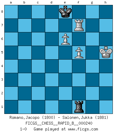 Last move : 1-0 2016 July 20 13:42:41 [Event "FICGS__CHESS__RAPID_B__000240"] [Site "FICGS"] [Date "2016.04.02"] [Round "1"] [White "Romano,Jacopo"] [Black "Salonen,Jukka"] [Result "1-0"] [WhiteElo "1800"] [BlackElo "1881"] 1.Nf3 d5 2.d4 Nf6 3.c4 e6 4.Nc3 Bb4 5.cxd5 exd5 6.Bg5 h6 7.Bh4 g5 8.Bg3 Ne4 9.Nd2 Nxg3 10.hxg3 c5 11.a3 Bxc3 12.bxc3 Nc6 13.e3 Bf5 14.Bb5 Qa5 15.Qf3 Qxc3 16.O-O Bg6 17.Qxd5 O-O 18.Qa2 cxd4 19.Rfc1 Qa5 20.Bxc6 bxc6 21.Rxc6 Kg7 22.Nb3 Qd5 23.Nxd4 Qxa2 24.Rxa2 Rac8 25.f3 Rxc6 26.Nxc6 a6 27.Rb2 Bd3 28.e4 Bb5 29.Nd4 Rd8 30.Rb4 g4 31.Nf5+ Kh7 32.a4 Rd1+ 33.Kf2 Bd7 34.Rb7 Be6 35.Ke3 Ra1 36.Nd4 Bc4 37.Rb4 Bf1 38.Kf4 a5 39.Rb7 gxf3 40.gxf3 Bc4 41.Rc7 Rxa4 42.Ra7 Ra3 43.g4 Kg7 44.Rc7 Ba2 45.Rc1 Be6 46.Ke5 a4 47.Nxe6+ fxe6 48.f4 Re3 49.Rc7+ Kg8 50.Re7 Rb3 51.Rxe6 Kf7 52.Rf6+ Kg7 53.Ra6 Rg3 54.Rxa4 Rxg4 55.Ra7+ Kg8 56.Kf5 Rg3 57.e5 Rf3 58.e6 Kf8 59.Rf7+ Ke8 60.Kg6 h5 61.Kxh5 Rf1 62.f5 1-0 Reti Opening Kingside Castling by player White (move 16) Kingside Castling by player Black (move 17) 10 pieces endgame at move 47 : White KRPPP , Black KRPPP WHITE : King + 1 Rook 3 Pawns BLACK : King + 1 Rook 3 Pawns 9 pieces endgame at move 51 : White KRPPP , Black KRPP WHITE : King + 1 Rook 3 Pawns BLACK : King + 1 Rook 2 Pawns 8 pieces endgame at move 54 : White KRPPP , Black KRP WHITE : King + 1 Rook 3 Pawns BLACK : King + 1 Rook 1 Pawn 7 pieces endgame at move 54 : White KRPP , Black KRP WHITE : King + 1 Rook 2 Pawns BLACK : King + 1 Rook 1 Pawn 6 pieces endgame at move 61 : White KRPP , Black KR WHITE : King + 1 Rook 2 Pawns BLACK : King + 1 Rook Player White won this chess game. Follow this game move after move (download)Bobby is the finest Chess player this country ever produced. His memory for the moves, his brilliance in dreaming up combinations, and his fierce determination to win are uncanny. (John Collins) Nur ein wirklich starker Spieler weiß wie schwach er spielt. (Savielly Grigorievitsch Tartakower) Hay dos clases de hombres: aquellos que se conforman en dejarse llevar por las circunstancias y que juegan barajas y aquellos decididos a controlar las circunstancias y que juegan al Ajedrez. (Mortimer Collins) Soyez une menace à chaque fois que vous vous asseyez pour jouer. (Ken Smith) Chess, like love, like music, has the power to make people happy. (Siegbert Tarrasch)
