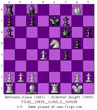 Last move : 1-0 2007 April 9 11:45:48 [Event "FICGS__CHESS__CLASS_D__000038"] [Site "FICGS"] [Date "2007.03.25"] [Round "1"] [White "Behrmann,Klaus"] [Black "Oldenhof,Dwight"] [Result "1-0"] [WhiteElo "1651"] [BlackElo "1400"] 1.e4 e5 2.f4 exf4 3.Nf3 d5 4.exd5 Qxd5 5.Nc3 Qh5 6.d4 g5 7.Qe2+ Be7 8.Nd5 Kd8 9.Qe5 Na6 10.Qxh8 Qg6 11.Ne5 Bf6 12.Nxf6 Qxf6 13.Qxg8+ Ke7 14.Bxa6 bxa6 15.O-O h6 16.Re1 1-0 KGA : Abbazia defense (Classical defense, Modern defense!) Kingside Castling by player White (move 15) Player White won this chess game. Follow this game move after move (download)What would Chess be without silly mistakes ? (Kurt Richter) Alle offensichtlichen Züge sehen nach dem Spiel in der Analyse verdächtig aus. (Viktor Kortschnoi) Un mal plan es mejor que no tener ningún plan. (Frank Marshall) A ce moment-là, je menaçais de comprendre la position ! (Clément L'Heureux) A government big enough to give you everything you want is strong enough to take everything you have. (Thomas Jefferson)