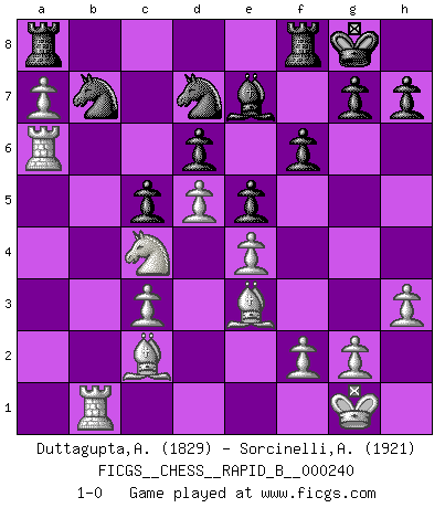 Last move : 1-0 2016 June 9 19:10:46 [Event "FICGS__CHESS__RAPID_B__000240"] [Site "FICGS"] [Date "2016.04.02"] [Round "1"] [White "Duttagupta,Aniruddha"] [Black "Sorcinelli,Andrea"] [Result "1-0"] [WhiteElo "1829"] [BlackElo "1921"] 1.e4 e5 2.Nf3 Nc6 3.Bb5 a6 4.Ba4 Nf6 5.O-O Be7 6.d3 b5 7.Bb3 d6 8.a4 Bd7 9.c3 O-O 10.Bc2 b4 11.Re1 Bg4 12.h3 Bxf3 13.Qxf3 Nd7 14.Qd1 Rb8 15.Nd2 Na5 16.d4 bxc3 17.bxc3 Nf6 18.Qe2 Nc6 19.Qxa6 Qd7 20.d5 Nd8 21.a5 Qc8 22.Qxc8 Rxc8 23.a6 Ra8 24.Nc4 Nd7 25.Be3 c5 26.a7 f6 27.Ra6 Nb7 28.Rb1 1-0 Ruy Lopez : Closed defense Kingside Castling by player White (move 5) Kingside Castling by player Black (move 9) Player White won this chess game. Follow this game move after move (download)My opponents make good moves too. Sometimes I don't take these things into consideration. (Bobby Fischer) Ich las kürzlich ein Buch von Nietzsche. Er sagte Religion verdumme nur die Menschen. Ich stimme zu. (Robert James Fischer) El Ajedrez es una hermosa aventura. (Bent Larsen) L'attaque fait le spectacle, la défense gagne les matchs. (Dicton footballistique) No enterprise is more likely to succeed than one concealed from the enemy until it is ripe for execution. (Niccolo Machiavelli)