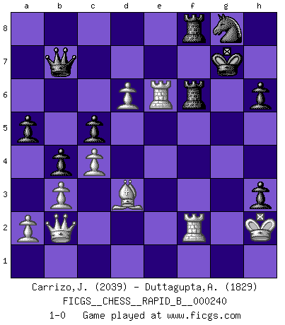 Last move : 1-0 2016 September 25 11:0:43 [Event "FICGS__CHESS__RAPID_B__000240"] [Site "FICGS"] [Date "2016.04.02"] [Round "1"] [White "Carrizo,Jose"] [Black "Duttagupta,Aniruddha"] [Result "1-0"] [WhiteElo "2039"] [BlackElo "1829"] 1.e4 c5 2.Nf3 d6 3.d4 cxd4 4.Nxd4 Nf6 5.Nc3 a6 6.Be2 e5 7.Nb3 Be7 8.O-O O-O 9.Be3 Be6 10.Qd3 Nbd7 11.Nd5 Bxd5 12.exd5 Nc5 13.Nxc5 dxc5 14.Bf3 Bd6 15.Bg5 h6 16.Bh4 g6 17.c4 Kg7 18.Rae1 Qa5 19.Qc2 b5 20.b3 Rab8 21.Bd1 Nd7 22.f3 Rbe8 23.Re2 f5 24.Be1 b4 25.Bd2 Qc7 26.Qc1 g5 27.g3 Nf6 28.Bc2 e4 29.Qe1 Qe7 30.fxe4 fxe4 31.Kg2 Rf7 32.Qd1 Ref8 33.Rf5 Kg8 34.Re1 a5 35.Bb1 Kg7 36.Be3 Qd7 37.Ref1 Qe7 38.Qe2 Be5 39.h4 gxh4 40.Bxe4 Bxg3 41.Bd3 Bd6 42.Kh1 Ng8 43.Qb2+ Rf6 44.Bf2 Bg3 45.Re1 Qc7 46.Re6 Bxf2 47.Rxf2 h3 48.d6 Qb7+ 49.Kh2 1-0 This chess game has been lost on time (started : 2016.04.02 1:7:53) Sicilian : Najdorf, Opovcensky variation Kingside Castling by player White (move 8) Kingside Castling by player Black (move 8) Player White won this chess game. Follow this game move after move (download)A thorough understanding of the typical mating continuations makes the most complicated sacrificial combinations leading up to them not only not difficult, but almost a matter of course. (Siegbert Tarrasch) Zu meiner Zeit war ein 20 jähriger ein junger Spieler, heute ist er ein Veteran. (Garry Kasparov) Un jugador que trata de regresar una movida en el Ajedrez es un futuro carterista. (Richard Fenton) Votre seul travail dans les ouvertures est d'obtenir un milieu de partie jouable. (Lajos Portish) Those parts of the system that you can hit with a hammer (not advised) are called hardware; those program instructions that you can only curse at are called software. (Anonymous)