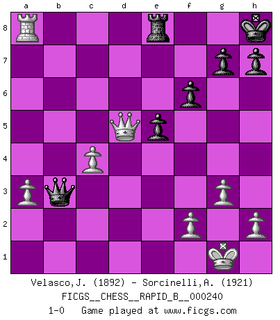 Last move : 1-0 2016 May 31 18:5:3 [Event "FICGS__CHESS__RAPID_B__000240"] [Site "FICGS"] [Date "2016.04.02"] [Round "1"] [White "Velasco,Jose Maria"] [Black "Sorcinelli,Andrea"] [Result "1-0"] [WhiteElo "1892"] [BlackElo "1921"] 1.d4 Nf6 2.c4 e6 3.Nf3 b6 4.g3 Bb7 5.Bg2 Be7 6.O-O O-O 7.Nc3 Ne4 8.Qc2 Nxc3 9.Qxc3 c5 10.Rd1 d6 11.b3 Bf6 12.Qc2 Nc6 13.Bb2 Qe7 14.e3 Rac8 15.Qe2 Rfe8 16.Rac1 Rcd8 17.a3 Nb8 18.e4 Qc7 19.dxc5 Bxb2 20.cxd6 Rxd6 21.Qxb2 Rxd1+ 22.Rxd1 Bxe4 23.Qe2 Bb7 24.Ne5 Bxg2 25.Kxg2 Qb7+ 26.Kg1 Qe7 27.b4 f6 28.Nf3 a5 29.bxa5 bxa5 30.Nd4 Nd7 31.Nc6 Qc5 32.Rxd7 Qxc6 33.Qd3 e5 34.Ra7 Qa4 35.Qd5+ Kh8 36.Rxa5 Qb3 37.Ra8 1-0 Queen's Indian : Old Main line, 7.Nc3 Kingside Castling by player White (move 6) Kingside Castling by player Black (move 6) Player White won this chess game. Follow this game move after move (download)An attack on the wing should be met by play in the center. (Nimzovitch) Frage: Wie viele Autos haben Sie schon zerstört? - Antwort: Nur zwei. (Loek van Wely) El Rey es una pieza de pelea. ¡Usenlo!. (Wilhelm Steinitz) Les Echecs sont affaire de jugement sensible. Savoir quand frapper et quand esquiver. (Fischer) . 'gn is not allowed in chess unless n is an integer between 1 and 8 inclusive, where 1 and 8 are to interpreted as the standard numerals standing for integers in the ordered real-closed field R, with the *canonical* ordering. (As opposed to, say, an integer in the domain Z[2+i*sqrt(5)] or an integer in some exotic Grothendieck topos). (Normajean Yates)