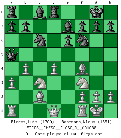 Last move : 1-0 2007 July 13 5:59:40 [Event "FICGS__CHESS__CLASS_D__000038"] [Site "FICGS"] [Date "2007.03.25"] [Round "1"] [White "Flores,Luis"] [Black "Behrmann,Klaus"] [Result "1-0"] [WhiteElo "1700"] [BlackElo "1651"] 1.e4 c6 2.c4 d5 3.exd5 cxd5 4.cxd5 Qxd5 5.Nc3 Qd8 6.d4 e6 7.Nf3 Nf6 8.Bd3 Nc6 9.O-O Be7 10.a3 O-O 11.Bc2 Qa5 12.Bf4 Rd8 13.b4 1-0 Caro-Kann : Anti-anti-Caro-Kann defense Kingside Castling by player White (move 9) Kingside Castling by player Black (move 10) Player White won this chess game. Follow this game move after move (download)Chess is a fairy tale of 1001 blunders. (Savielly Tartakower) Schach ist wie eine schöne Frau, zu der wir ständig zurückkehren, gleichviel, wie oft sie uns zurückweist. (Anonymous) La partida mas dura de ganar es una partida ganada. (Emanuel Lasker) Plusieurs personnes se sont demandées comment Tal faisait pour gagner... En fait, c'est très simple ! Il met ses pièces au centre de l'échiquier et les sacrifie quelque part ! (David Bronstein) The existence of forgetting has never been proved: We only know that some things don't come to mind when we want them. (Friedrich Nietzsche)