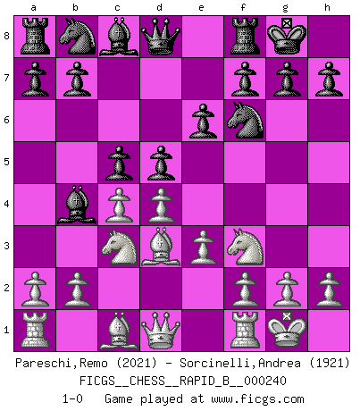 Last move : 1-0 2016 June 21 0:14:0 [Event "FICGS__CHESS__RAPID_B__000240"] [Site "FICGS"] [Date "2016.04.02"] [Round "1"] [White "Pareschi,Remo"] [Black "Sorcinelli,Andrea"] [Result "1-0"] [WhiteElo "2021"] [BlackElo "1921"] 1.d4 Nf6 2.c4 e6 3.Nc3 Bb4 4.e3 O-O 5.Bd3 d5 6.Nf3 c5 7.O-O 1-0 Nimzo-Indian : 4.e3 O-O, 5.Bd3 d5 Kingside Castling by player Black (move 4) Kingside Castling by player White (move 7) Player White won this chess game. Follow this game move after move (download)Half the variations which are calculated in a tournament game turn out to be completely superfluous. Unfortunately, no one knows in advance which half. (Jan Tinman) Deine Wertungszahl - vorausgesetzt einige Jahre schachliche Anstrengung - entspricht etwa dem zehnfachen Deines IQ plus 1000. (Jonathan Levitt) Por tratar de evitar la pérdida de una pieza, muchas personas han perdido una partida de Ajedrez. (Savielly Tartakover) Le pion, dans sa simplicité, marche droit devant lui, mais lorsqu'il prend, il le fait obliquement? Ainsi l'homme, tant qu'il reste pauvre, marche dans la droiture et vit honnêtement, mais lorsqu'il recherche les honneurs, il flatte, se parjure et, par les voies obliques, cherche une position supérieure sur l'échiquier du monde. (Jean de Galles) Art is the triumph over chaos. (John Cheever)