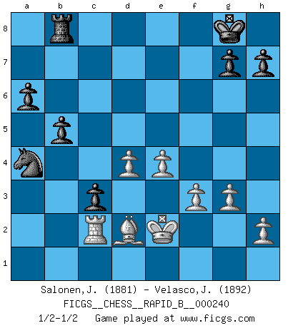 Last move : 1/2-1/2 2016 June 7 15:2:35 [Event "FICGS__CHESS__RAPID_B__000240"] [Site "FICGS"] [Date "2016.04.02"] [Round "1"] [White "Salonen,Jukka"] [Black "Velasco,Jose Maria"] [Result "1/2-1/2"] [WhiteElo "1881"] [BlackElo "1892"] 1.d4 Nf6 2.c4 e6 3.Nc3 Bb4 4.e3 O-O 5.Bd3 d5 6.Nf3 c5 7.O-O Nc6 8.a3 Bxc3 9.bxc3 Qc7 10.cxd5 exd5 11.a4 c4 12.Bc2 Re8 13.Nd2 Ng4 14.g3 Qa5 15.Bb2 Bd7 16.Rb1 f5 17.Qf3 Nf6 18.Bxf5 Bxf5 19.Qxf5 Qxa4 20.Ra1 Qb5 21.Rfb1 Na5 22.Bc1 Nb3 23.Nxb3 cxb3 24.Ra3 Qe2 25.Raxb3 b6 26.R3b2 Qc4 27.Rc2 Rac8 28.Rb4 Qa6 29.f3 Rc6 30.c4 Rxc4 31.R2xc4 dxc4 32.Qb5 Qxb5 33.Rxb5 Rb8 34.e4 a6 35.Rb2 b5 36.Bd2 Nd7 37.Kf1 Nb6 38.Rc2 Na4 39.Ke2 c3 1/2-1/2 Nimzo-Indian : 4.e3 O-O, 5.Bd3 d5 Kingside Castling by player Black (move 4) Kingside Castling by player White (move 7) This chess game ended in a draw. Follow this game move after move (download)Chess is above all, a fight ! (Emanuel Lasker) Ein Kibitz ist einer, der deinem Gegner gute Ratschläge gibt. (Andrew Soltis) Antes de los Finales, los dioses han colocado el Juego Medio. (Siegbert Tarrasch) Le génie consiste à savoir transgresser les règles au moment opportun. (Teichmann) I've lost money so fast in these clubs it's left me reeling. I've read every poker book ever written, but the only way to get better at the game is to go out and play with people who are really good. The problem is, you stand to lose a lot of money doing it. (Matt Damon)