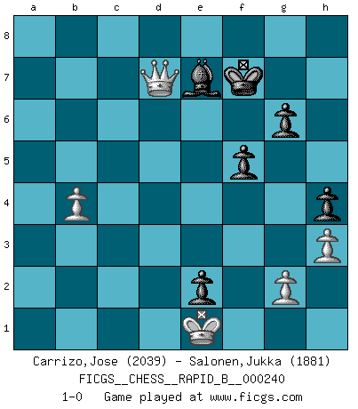 Last move : 1-0 2016 September 29 8:58:41 [Event "FICGS__CHESS__RAPID_B__000240"] [Site "FICGS"] [Date "2016.04.02"] [Round "1"] [White "Carrizo,Jose"] [Black "Salonen,Jukka"] [Result "1-0"] [WhiteElo "2039"] [BlackElo "1881"] 1.e4 e5 2.Nf3 Nc6 3.Bb5 a6 4.Ba4 Nf6 5.O-O Be7 6.Re1 b5 7.Bb3 d6 8.c3 O-O 9.h3 Na5 10.Bc2 c5 11.d4 Qc7 12.Nbd2 cxd4 13.cxd4 Nc6 14.Nb3 a5 15.Be3 a4 16.Nbd2 Bd7 17.Rc1 Rac8 18.Nf1 g6 19.Ng3 Rfe8 20.d5 Na5 21.b3 Qb8 22.Rb1 axb3 23.axb3 b4 24.Ra1 Nb7 25.Qd2 Nc5 26.Ra5 Bd8 27.Ra2 Be7 28.Rea1 Rc7 29.Ne1 h5 30.f3 h4 31.Ne2 Bb5 32.Nc1 Nh5 33.Qxb4 Rb7 34.Qd2 Ng3 35.Bf2 Bd7 36.Ned3 Ncxe4 37.fxe4 Nxe4 38.Qe3 Nxf2 39.Qxf2 Qc7 40.Nb2 Bb5 41.Bd1 Bd8 42.Kh1 e4 43.Be2 Bg5 44.Bc4 f5 45.Bxb5 Rxb5 46.Nc4 Qc5 47.Qf1 Reb8 48.Ra6 Bf6 49.R1a3 Be7 50.Ne5 Qxd5 51.Nc6 R8b7 52.Ne2 Bf6 53.Na5 R7b6 54.Nf4 Qc5 55.Rxb6 Qxb6 56.Nc4 Qd4 57.Ra6 Qc3 58.Nxd6 Rc5 59.Ra8+ Kh7 60.Ra7+ Rc7 61.Nb5 Rxa7 62.Nxc3 Bxc3 63.Kh2 Bf6 64.Qb5 Re7 65.Qc6 Kg7 66.Kg1 e3 67.Kf1 Kf7 68.Nd5 e2+ 69.Ke1 Re6 70.Qd7+ Re7 71.Nxe7 Bxe7 72.b4 1-0 Ruy Lopez : Closed Kingside Castling by player White (move 5) Kingside Castling by player Black (move 8) Player White won this chess game. Follow this game move after move (download)The boy (then a 12 year old boy named Anatoly Karpov) doesn't have a clue about Chess, and there's no future at all for him in this profession. (Mikhail Botvinnik) Jeder Fehler erscheint unglaublich dumm, wenn andre ihn begehen. (Georg Christoph Lichtenberg) Ser exitoso en el Ajedrez te permite descubrir tu propia personalidad. Eso es lo que deseo para los niños de mi clase. (Saudin Robovic) Toutes choses étant égales, c'est la conviction qui gagne. Alliée à une volonté de vaincre, elle sert de détonateur, suscite des idées, disperse les doutes et aide à penser clairement. (Robert Fischer) Heh, heh, heh. Time to abandon ship. (General Grievous in Star Wars ep.3)