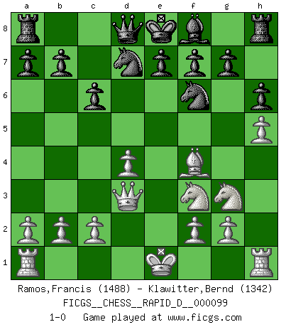 Last move : 1-0 2016 July 17 13:58:44 [Event "FICGS__CHESS__RAPID_D__000099"] [Site "FICGS"] [Date "2016.04.03"] [Round "1"] [White "Ramos,Francis"] [Black "Klawitter,Bernd"] [Result "1-0"] [WhiteElo "1488"] [BlackElo "1342"] 1.e4 c6 2.d4 d5 3.Nc3 dxe4 4.Nxe4 Bf5 5.Ng3 Bg6 6.h4 h6 7.Nf3 Nd7 8.h5 Bh7 9.Bd3 Bxd3 10.Qxd3 Ngf6 11.Bf4 1-0 This chess game has been lost on time (started : 2016.04.03 3:31:20) Caro-Kann : Classical, 7...Nd7 Player White won this chess game. Follow this game move after move (download)Though most people love to look at the games of the great attacking masters, some of the most successful players in history have been the quiet positional players. They slowly grind you down by taking away your space, tying up your pieces, and leaving you with virtually nothing to do ! (Yasser Seirawan) Sitze auf Deine Hände. (Siegbert Tarrasch) El Ajedrez es en su esencia, un juego. En su forma, un arte. Y en su ejecución, una ciencia. (Baron Tassilo) Aux échecs, l'amour-propre est satisfait quand on remporte la victoire, mais il n'y a pas de honte à être battu. (Benjamin Franklin) Every vice is only an exaggeration of a necessary and virtuous function. (Ralph Waldo Emerson, Journals 1936)