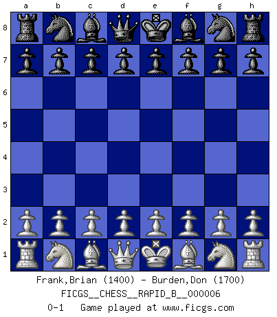 Last move : 0-1 2006 July 30 15:15:5 [Event "FICGS__CHESS__RAPID_B__000006"] [Site "FICGS"] [Date "2006.05.31"] [Round "1"] [White "Frank,Brian"] [Black "Burden,Don"] [Result "0-1"] [WhiteElo "1400"] [BlackElo "1700"] 0-1 This chess game has been lost on time (started : 2006.05.31 4:5:48) Player Black won this chess game. Follow this game move after move (download)By playing at Chess then, we may learn: First: Foresight... Second: Circumspection... Third: Caution... And lastly, we learn by Chess the habit of not being discouraged by present bad appearances in the state of our affairs, the habit of hoping for a favorable chance, and that of persevering in the secrets of resources. (Benjamin Franklin) Charakterschwächen offenbaren sich normalerweise während einer Schachpartie. (Garry Kasparov) Me siento como si fuera una pieza en una partida de Ajedrez, cuando mi oponente me indica: esa pieza no puede ser movida. (Soren Kierkegaard) Si je n'étais pas joueur d'échecs, je serais le meilleur dans quelque chose d'autre. (Anatoli Karpov) The Internet isn't free. It just has an economy that makes no sense to capitalism. (Brad Shapcott)