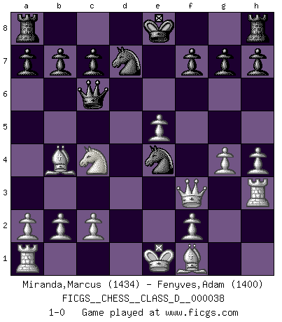 Last move : 1-0 2007 May 29 22:32:56 [Event "FICGS__CHESS__CLASS_D__000038"] [Site "FICGS"] [Date "2007.03.25"] [Round "1"] [White "Miranda,Marcus"] [Black "Fenyves,Adam"] [Result "1-0"] [WhiteElo "1434"] [BlackElo "1400"] 1.e4 d5 2.exd5 Qxd5 3.Nc3 Qa5 4.d4 Nf6 5.Nf3 Bg4 6.h3 Bh5 7.g4 Bg6 8.Ne5 e6 9.h4 Bb4 10.Rh3 Be4 11.Bd2 Nbd7 12.Nc4 Qa6 13.Nxe4 Nxe4 14.Bxb4 Qc6 15.Qf3 e5 16.dxe5 1-0 Scandinavian defense, Lasker variation Player White won this chess game. Follow this game move after move (download)No other master has such a terrific will to win. At the board he radiates danger, and even the strongest opponents tend to freeze, like rabbits when they smell a panther. Even his weaknesses are dangerous. As white, his opening game is predictable - you can make plans against it - but so strong that your plans almost never work. In the middle game his precision and invention are fabulous, and in the end game you simply cannot beat him. (Anonymous German Expert) Es genügt nicht ein guter Spieler zu sein, man muß auch gut spielen. (Siegbert Tarrasch) El Ajedrez es parte de una cultura y si una cultura esta en decadencia, entonces también el Ajedrez declinará. (Mikhail Botvinnik) Même si vous avez un bon coup à faire, regardez toujours s'il n'y en a pas un qui lui soit préférable. (Pedro Damiano) If only people were all showed a certain minimum level of niceness; if only people didn't retract verbal draw offers (without draw box ticked) on ficgs; if only people didn't kill; if only people didn't run concentration / extermination camps, if only people didn't drop nuclear bombs on Hiroshima and Nagasaki, and so on - it would be a much more beautiful world. But sadly, things are not so... (Normajean Yates)