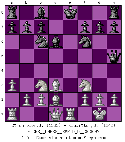 Last move : 1-0 2016 July 20 2:17:34 [Event "FICGS__CHESS__RAPID_D__000099"] [Site "FICGS"] [Date "2016.04.03"] [Round "1"] [White "Strohmeier,Josef"] [Black "Klawitter,Bernd"] [Result "1-0"] [WhiteElo "1333"] [BlackElo "1342"] 1.e4 d5 2.exd5 Qxd5 3.Nc3 Qa5 4.d4 e5 5.dxe5 Bb4 6.Bd2 Nc6 7.a3 Qxe5+ 8.Be2 Bd6 9.Nf3 Qf5 10.O-O Nf6 11.Bd3 Qh5 12.Re1+ 1-0 This chess game has been lost on time (started : 2016.04.03 3:31:20) Scandinavian : Anderssen counter-attack Kingside Castling by player White (move 10) Player White won this chess game. Follow this game move after move (download)Capture of the adverse King is the ultimate but not the first object of the game. (William Steinitz) Nur ein wirklich starker Spieler weiß wie schwach er spielt. (Savielly Grigorievitsch Tartakower) Cuando estes solo, cuando te sientas un extraño en el mundo, juega al Ajedrez. Esto levantará tu espiritu y será tu consejero de guerra. (Aristóteles) Un journaliste : 'Vous préférez avoir une dame de plus sur l'échiquier ou au lit ?' Boris Spassky : 'Ca dépend de la position.' The production of too many useful things results in too many useless people. (Karl Marx)