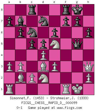 Last move : 0-1 2016 June 27 8:37:25 [Event "FICGS__CHESS__RAPID_D__000099"] [Site "FICGS"] [Date "2016.04.03"] [Round "1"] [White "Simonnet,Franck"] [Black "Strohmeier,Josef"] [Result "0-1"] [WhiteElo "1453"] [BlackElo "1333"] 1.d4 Nf6 2.Nf3 d5 3.e3 e6 4.Bd3 Be7 5.O-O O-O 6.Nbd2 c5 7.b3 Nc6 8.Bb2 b6 9.Ne5 Bb7 10.a3 Rc8 11.f4 Nd7 12.Qh5 Nf6 13.Qh3 h6 14.g4 Nd7 15.g5 Bxg5 16.fxg5 Qxg5+ 0-1 Queen's pawn game Kingside Castling by player White (move 5) Kingside Castling by player Black (move 5) Player Black won this chess game. Follow this game move after move (download)A man without frontiers. He didn't divide the East and the West, he brought them together in their admiration for him. (Ljubomir Ljubojevic, about Bobby Fischer's death) Mein Gehirn das ist mein zweitwichtigstes Organ [Aus dem Film: Der Schläfer]. (Woody Allen) Si tu oponente no puede hacer nada activo, entonces no apures la posición; En vez de eso, dejalo estar sentado ahí, sufriendo y rogandote por un empate. (Jeremy Silman) J'ai toujours senti une vague pitié pour l'homme qui ne connaît rien aux échecs, tout comme j'en aurais pour un homme ignorant de l'amour. Les Echecs, comme la musique ou comme l'amour, ont le pouvoir de rendre heureux. (Siegbert Tarrasch) Your best chance to get a Royal Flush in a casino is in the bathroom. (Anonymous)