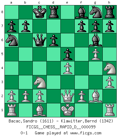 Last move : 0-1 2016 July 13 1:33:5 [Event "FICGS__CHESS__RAPID_D__000099"] [Site "FICGS"] [Date "2016.04.03"] [Round "1"] [White "Bacac,Sandro"] [Black "Klawitter,Bernd"] [Result "0-1"] [WhiteElo "1611"] [BlackElo "1342"] 1.e4 Nf6 2.d4 d6 3.Nc3 c6 4.Nf3 Bg4 5.h3 Bh5 6.Qe2 Na6 7.g4 Bg6 8.Bg2 Qd7 9.g5 Ng8 10.Nh4 O-O-O 11.d5 e5 12.dxc6 Qxc6 0-1 This chess game has been lost on time (started : 2016.04.03 3:31:20) Alekhine's defense Queenside Castling by player Black (move 10) Player Black won this chess game. Follow this game move after move (download)The game of Chess is not merely an idle amusement; several very valuable qualities of the mind are to be acquired and strengthened by it, so as to become habits ready on all occasions; for life is a kind of Chess. (Benjamin Franklin) Schach ist ein Kampf gegen den Fehler. (Johannes Herrman Zukertort) Tu no necesitas jugar muy bien, únicamente ayudar a tu oponenet a que juegue muy mal. (Genrikh Chepukaitis) Il n'y a plus de joueurs du niveau de Jacob Murray dont la seule quête est le beau jeu, le plaisir de voir les pièces construire quelque chose. Sur 10 idées à la minute, 9 seront sans intérêt, la dernière s'avèrera géniale. (Christian Bauer) If you don't practice you don't deserve to win. (Andre Agassi)